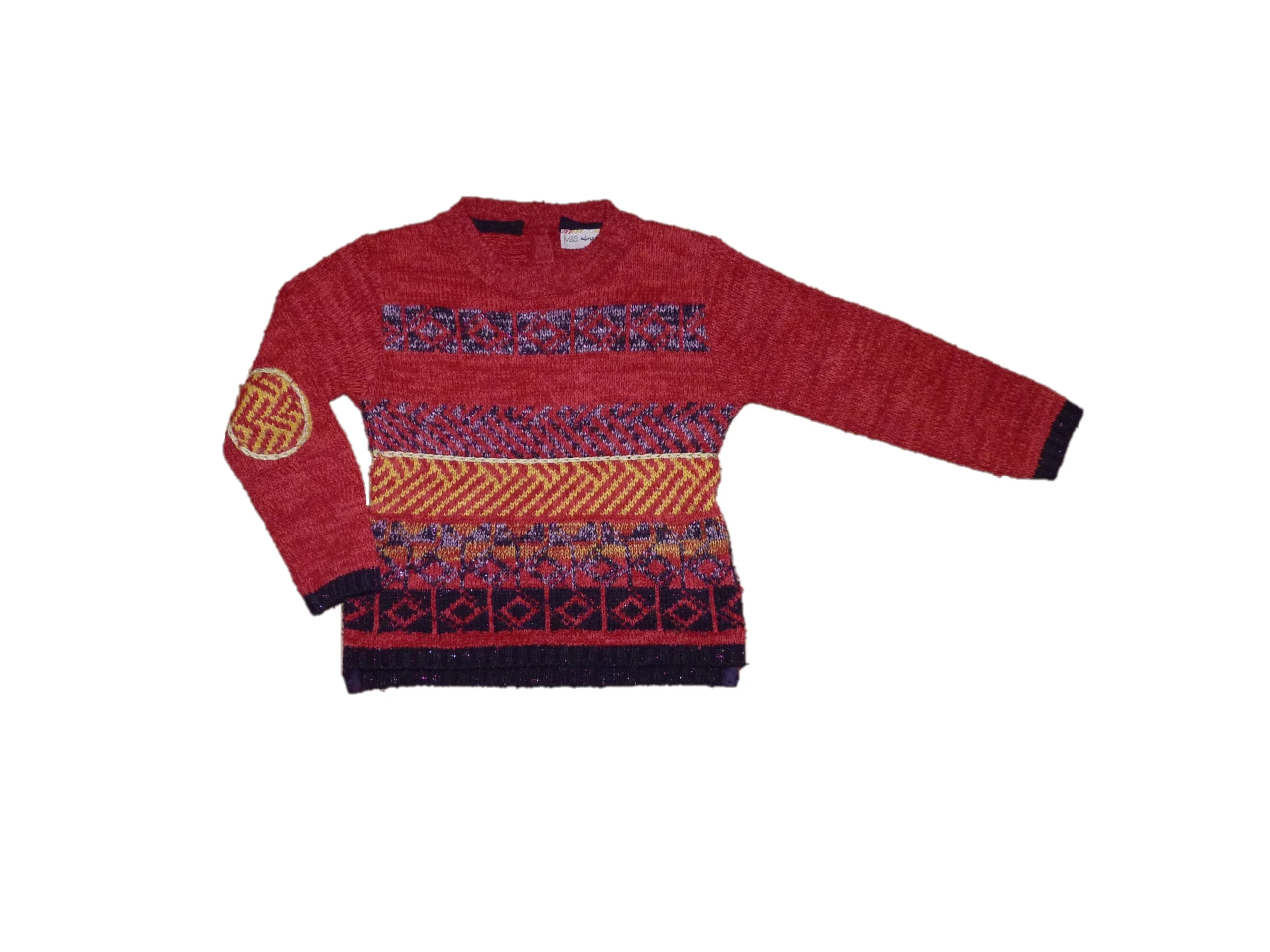 Puha kötött pulóver hosszú ujjal, nyaki hátsó részén gombokkal, csillogó szálakkal átszőve, különleges meleg színekkel, kissé hosszabb hátrésszel. Jó állapotú, közelről némi bolyhosodás. Tökéletes viselet farmerhez vagy szoknyához. Beleírt méret 3-4 év. |
