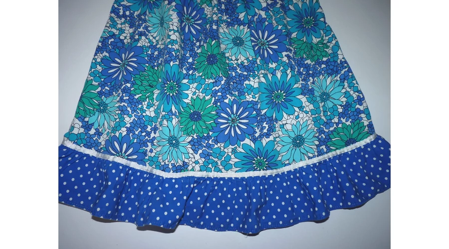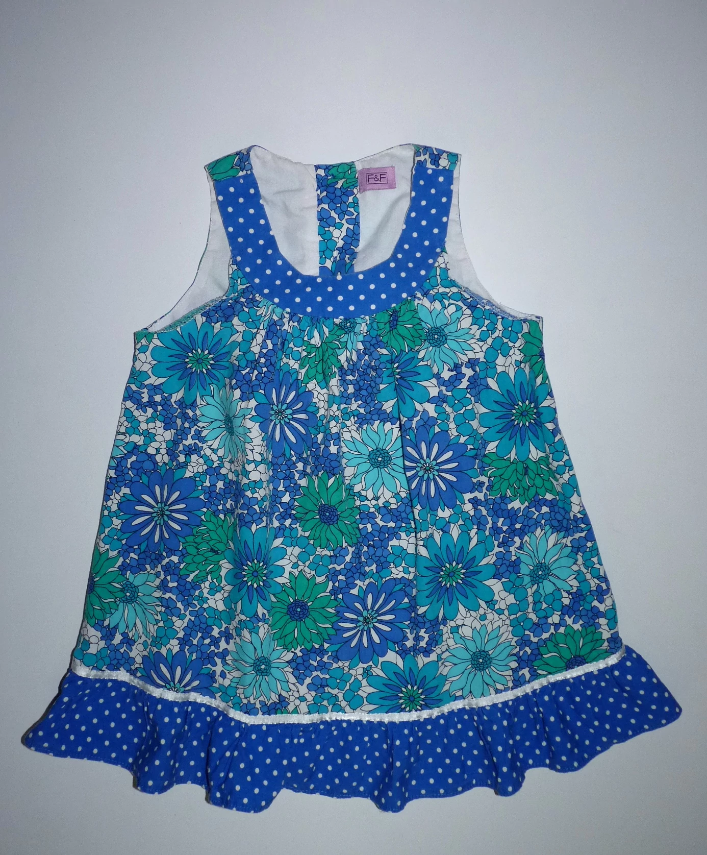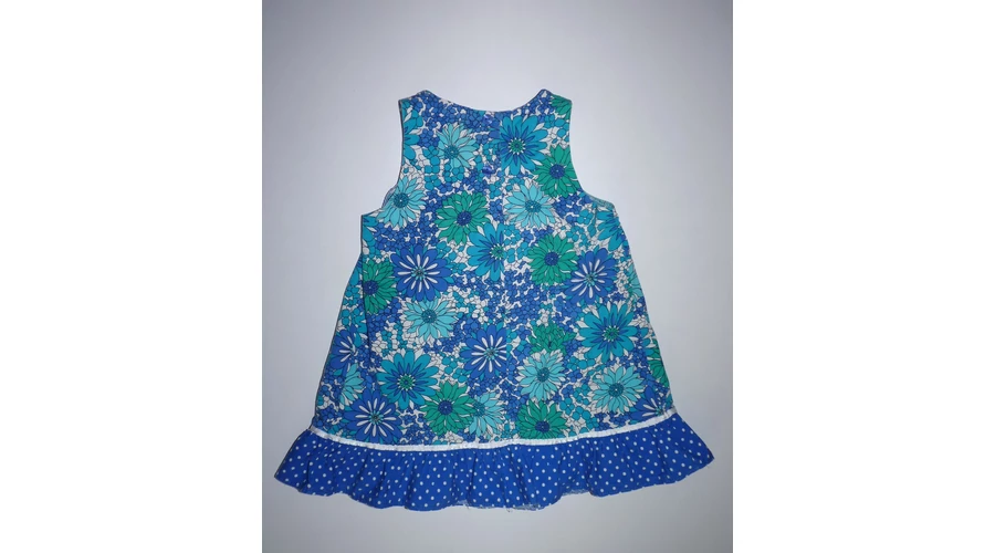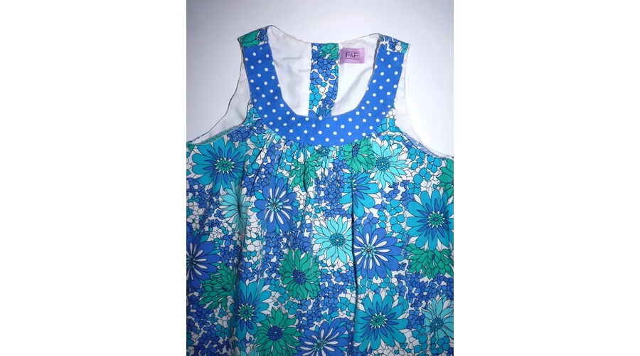 Ujjatlan, nyomott mintás, enyhén bővülő fazonú pamut ruha/tunika alul pöttyös kis fodorral, nyakán pöttyös szegéllyel, nyaki hátsó részén gombokkal. Beleírt méret 4-5 év (110) |