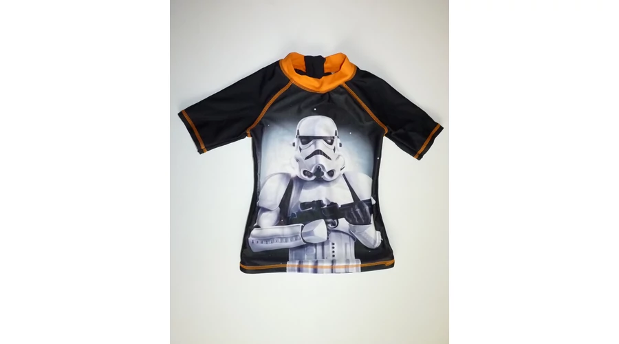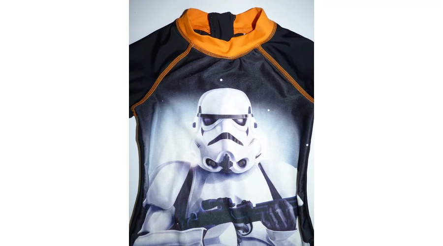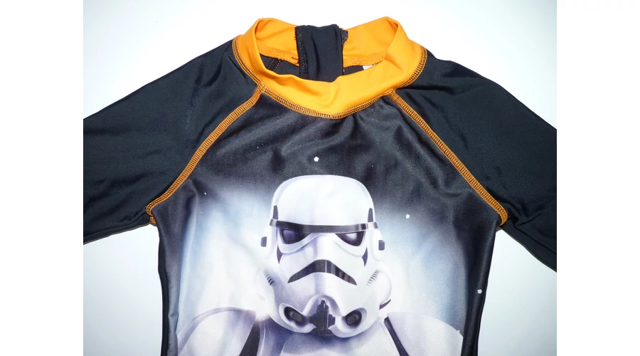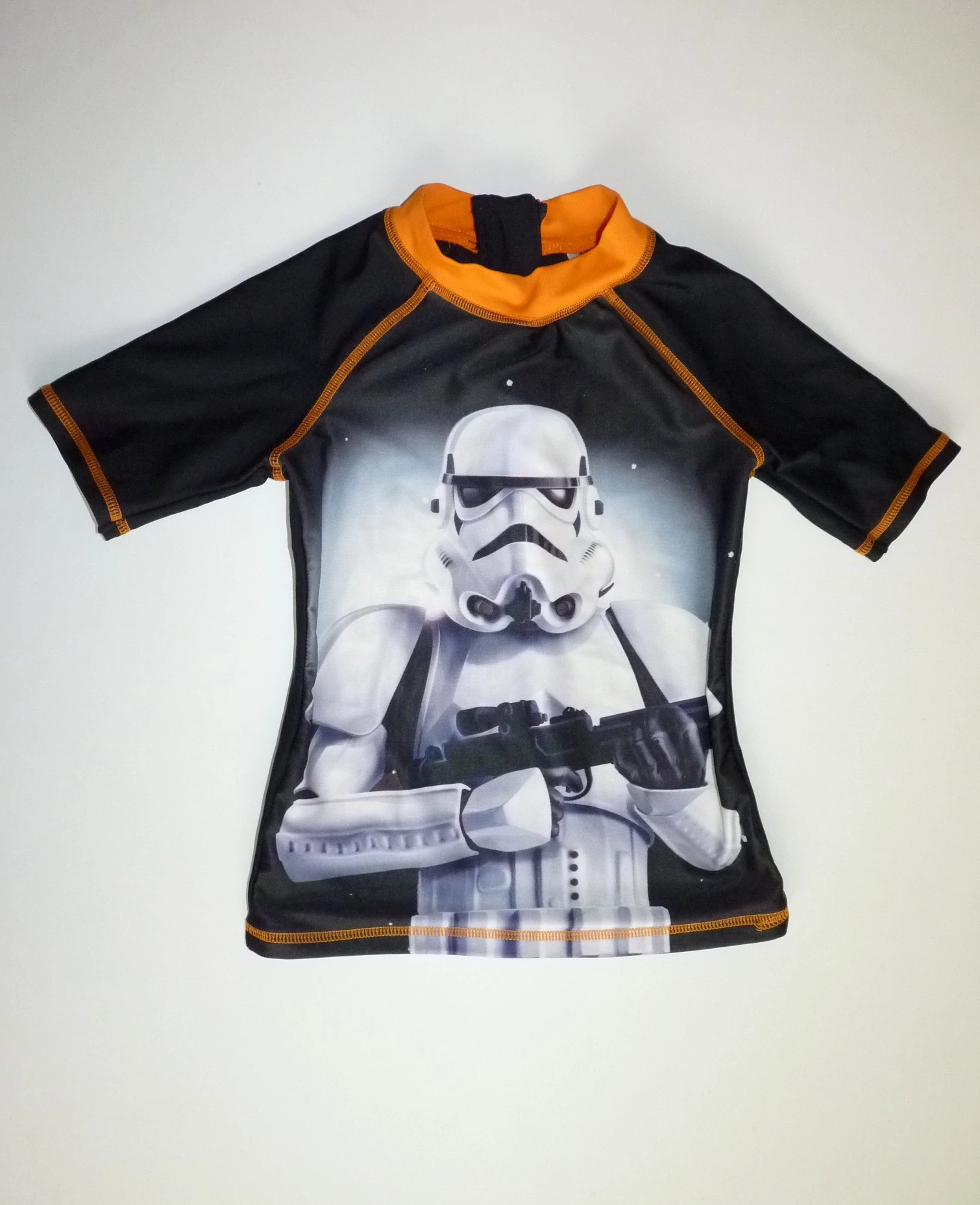 Divatos úszó felső, elején szuper Star Wars mintával. Vagány fekete-narancs színű. Nagyon jó állapotú, hátul cipzár segíti az öltözködést. Könnyen száradó, rugalmas fürdőruha anyagú. Beleírt méret 5-6 év (110/116). |