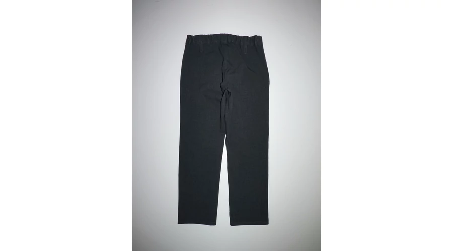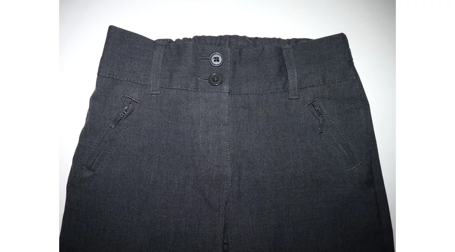 Sötétszürke alkalmi lány szövetnadrág, állítható gumírozott derékkal, dupla gombos sliccel, cipzáros oldalzsebekkel, derekán övbújtatókkal. Jó állapotú, minimális fényesedés térdnél és a gombok mellett. Beleírt méret 5-6 év (116) |