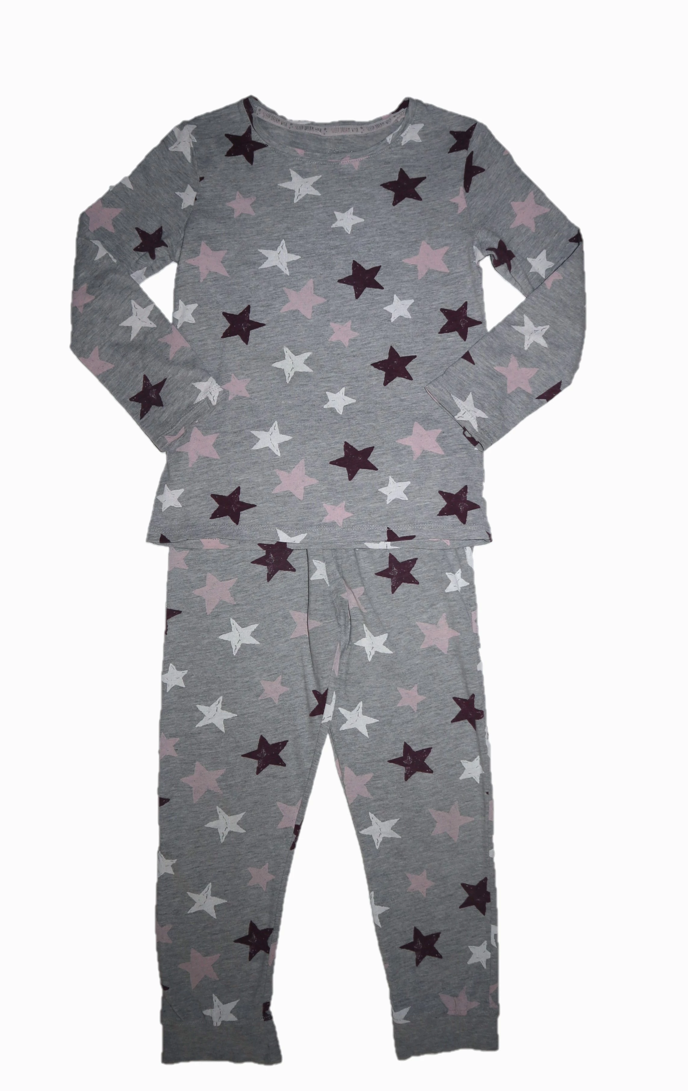 Kétrészes dzsörzé pizsama vagány koptatott csillag mintával. Felső hosszú ujjal, kerek nyakkal, nadrág gumírozott derékkal, bordás passzés alsó szegéllyel. Jó állapotú, némi bolyhosodás, előre tartó varrás. Beleírt méret 6-7 év (122) |