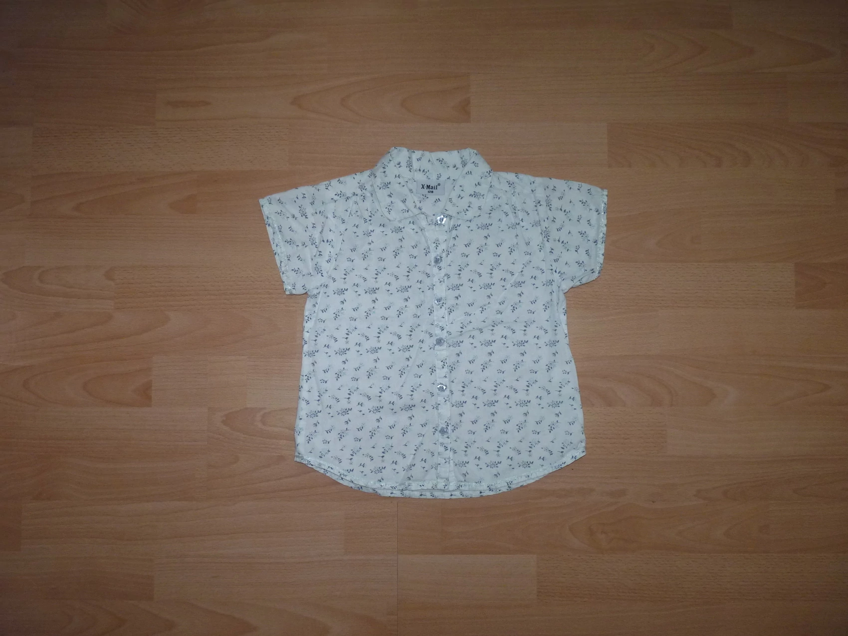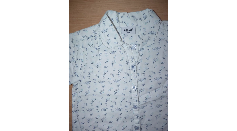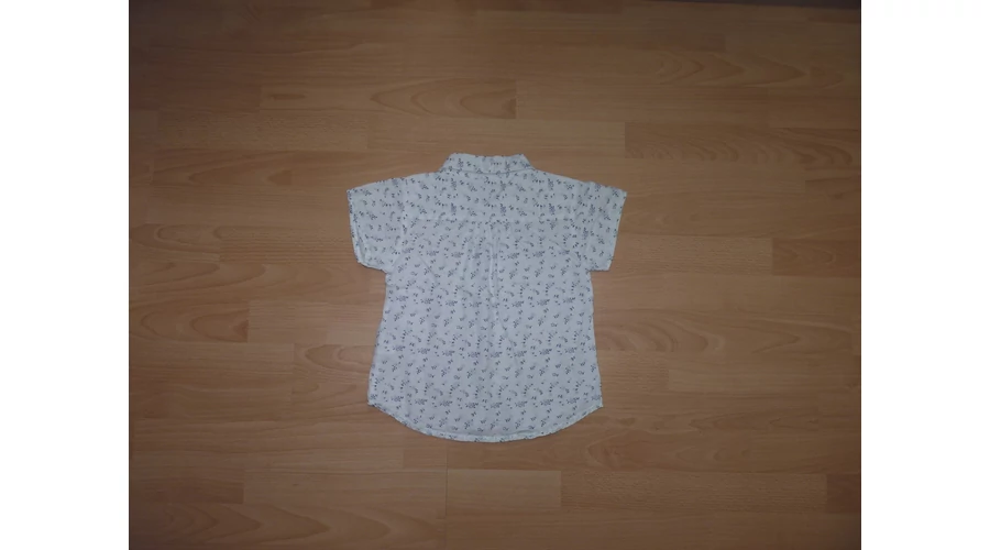Apró kék virágmintával díszített, fehér rövid ujjú pamut blúz, virág alakú gombokkal, fényes szegéllyel. Jó állapotú, minimális felületi bolyhosodás, egyik gomb alatt apró halvány folt. Tökéletes ruha alá, szoknyához, de farmerral is csinos! Beleírt méret: 128. |
