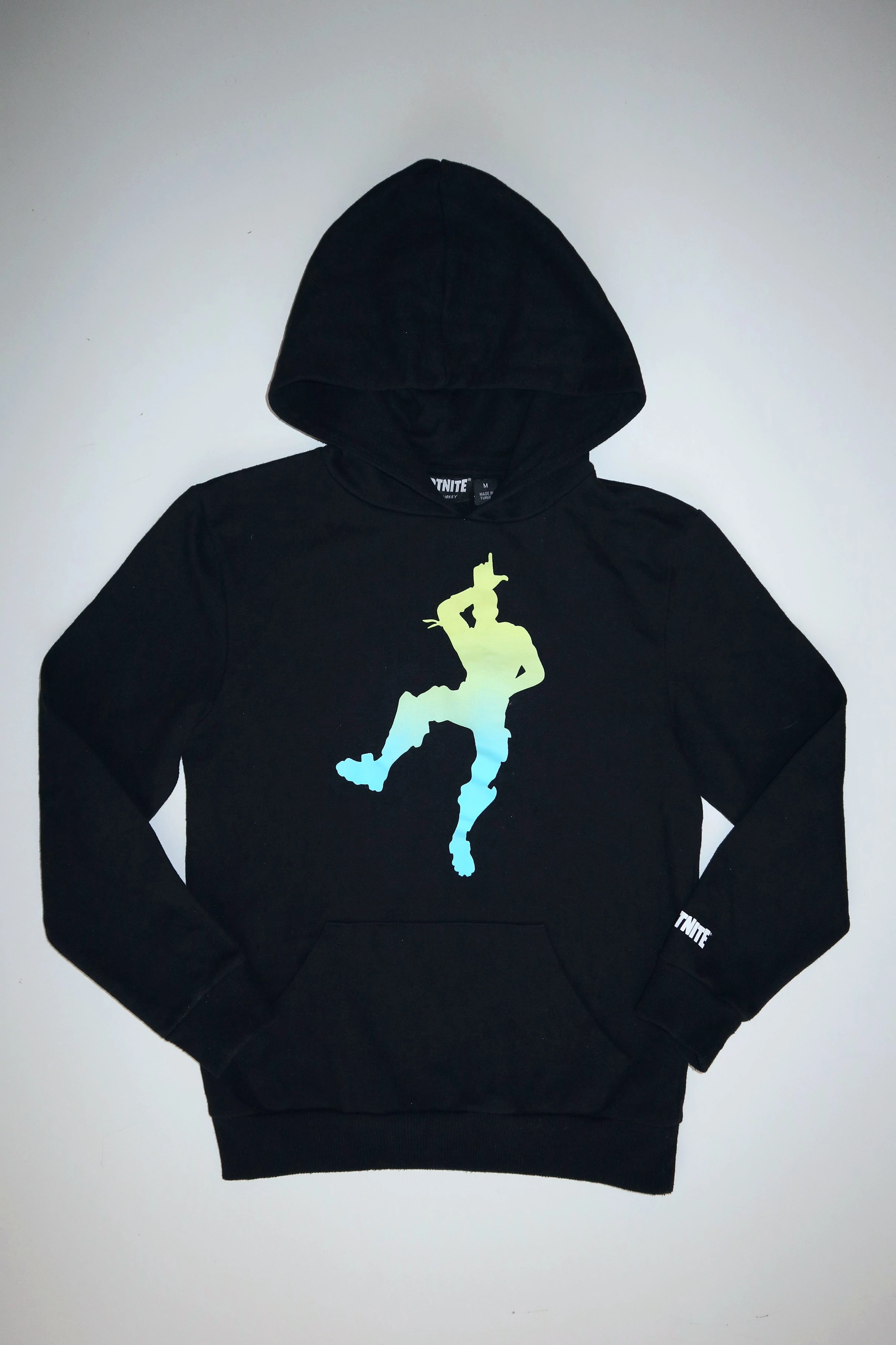 Puha pamutkeverék melegítőfelső hosszú ujjal, kapucnival, bordás passzés kézelővel és alsó szegéllyel, kenguruzsebbel, puhára bolyhozott fonákkal, elején és ujján Fortnite mintával. Szép állapotú. Beleírt méret M. |