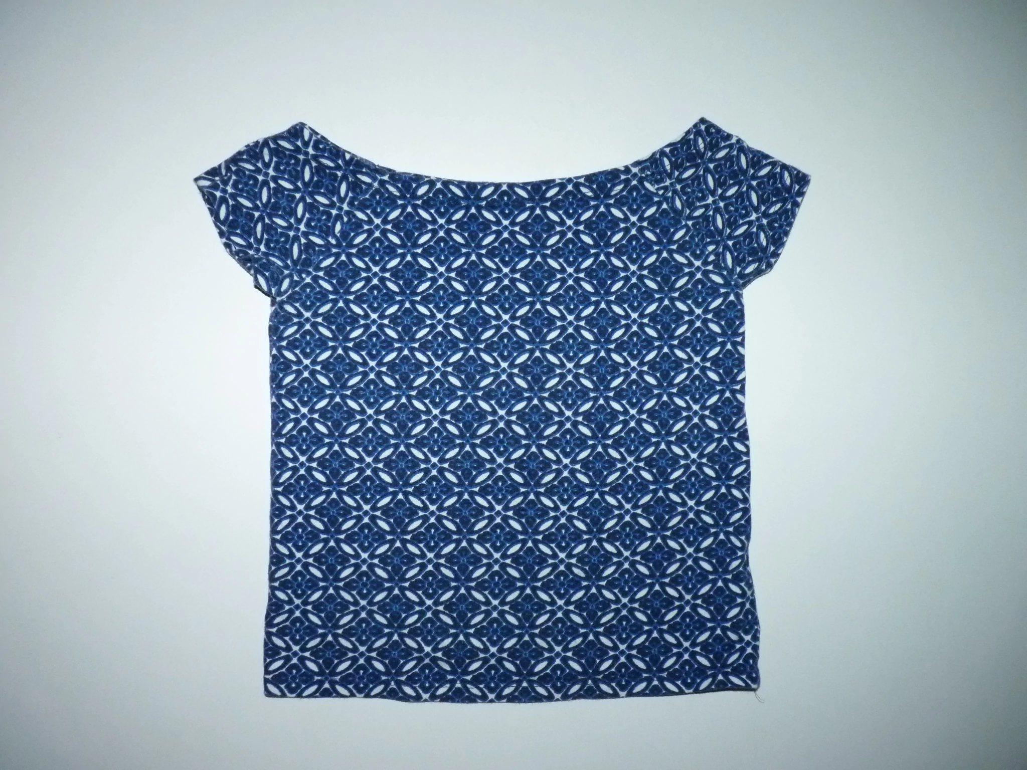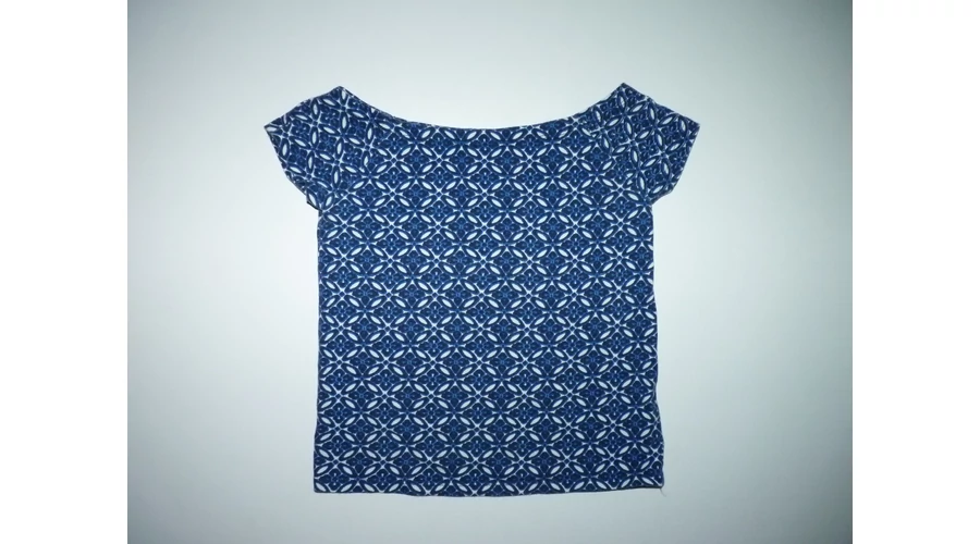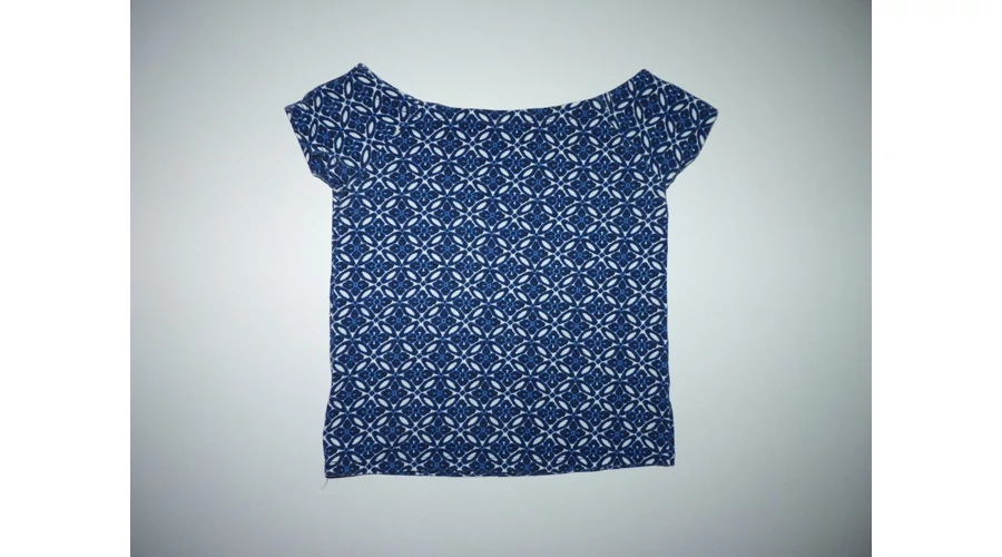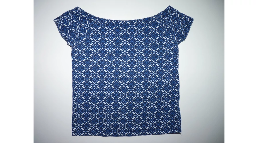 Puha rövid nyári top rövid raglánujjal, szélesebb nyakkivágással, kék-fehér virágos mintával, enyhén rugalmas anyagból. Beleírt méret nincs. |