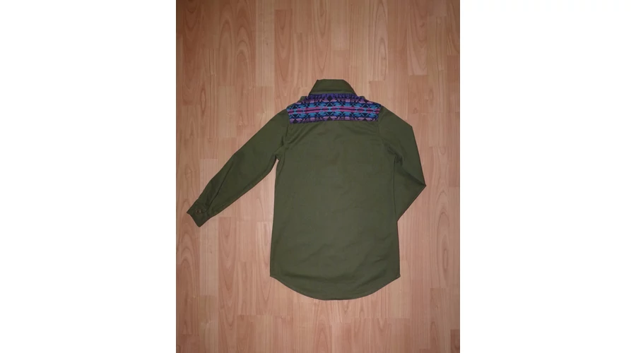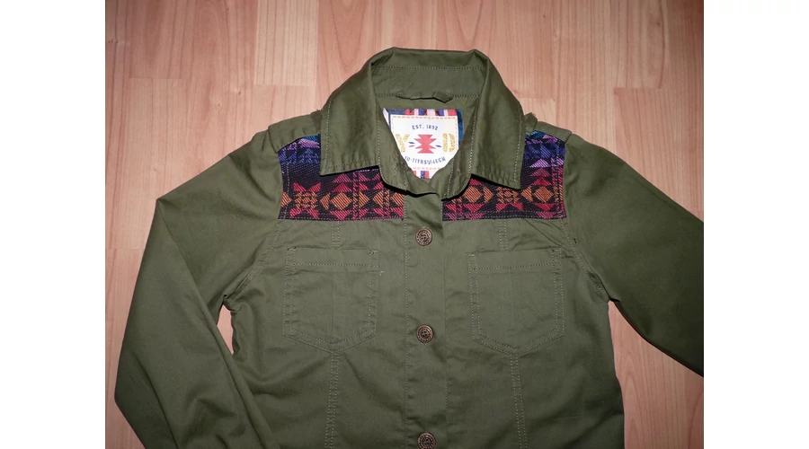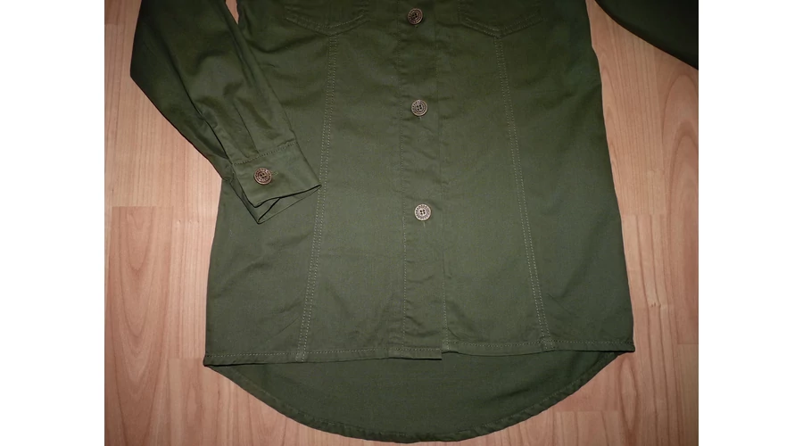 Puha pamutszövet tunika gallérral, elöl különleges gombokkal, két mellzsebbel, szűkítővel, vállapokkal, hosszú kézelőjén gombos ujjal, lekerekített enyhén hosszabb háttal. Keki színű, vállán színes rátéttel. Nagyon jó minőségű és állapotú, hátul kis fényesedés. Beleírt méret 10-11 év (146). |