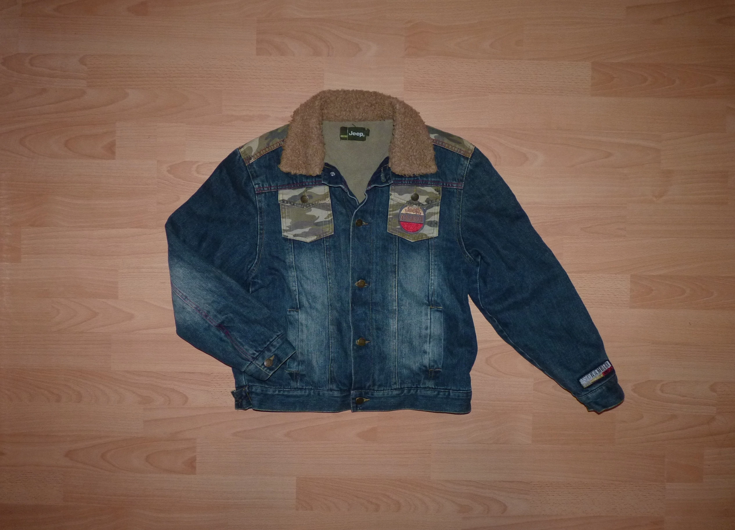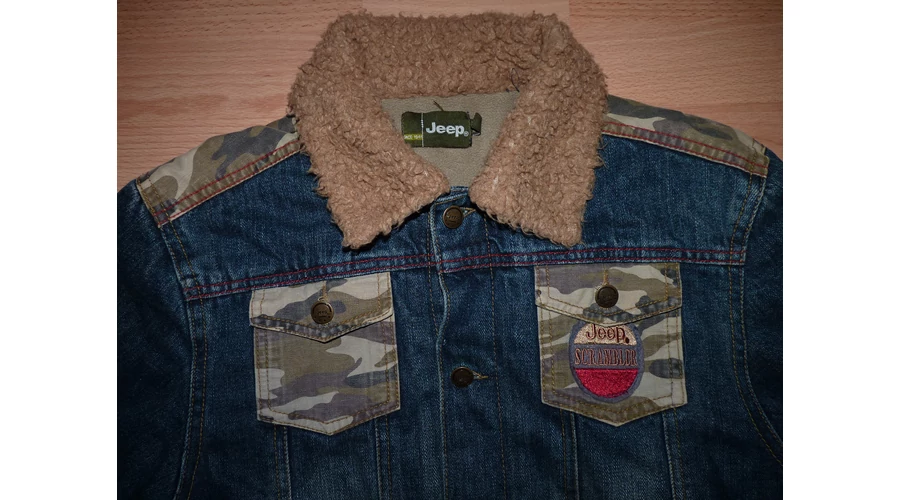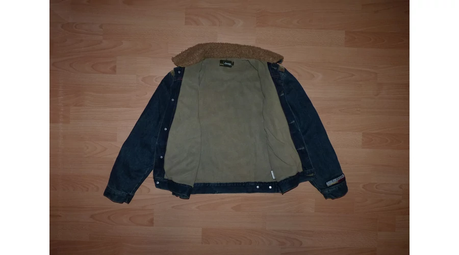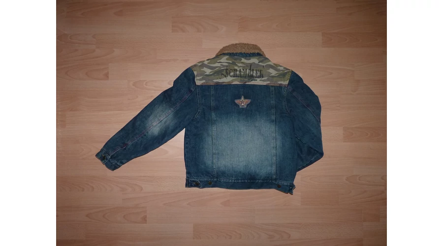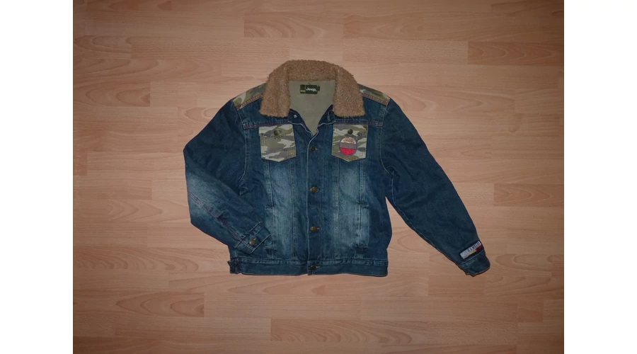 Koptatott farmerdzseki bélelt gallérral, elöl gombokkal, terepmintás zsebekkel, és vállrésszel, hátán dekoratív emblémával, hosszú, gombos kézelős ujjal, szűkíthető alsó szegéllyel, polár béléssel. Jó állapotú, nyaka használtabb. (fotó) Beleírt méret 11-12 év (146-152) |