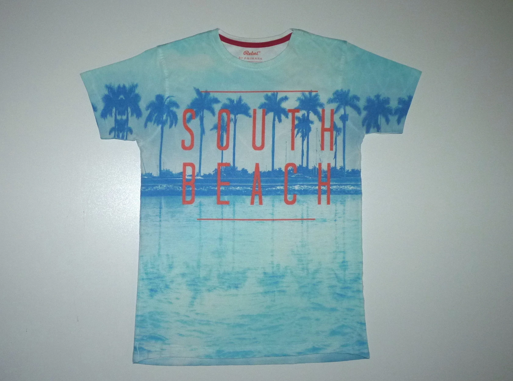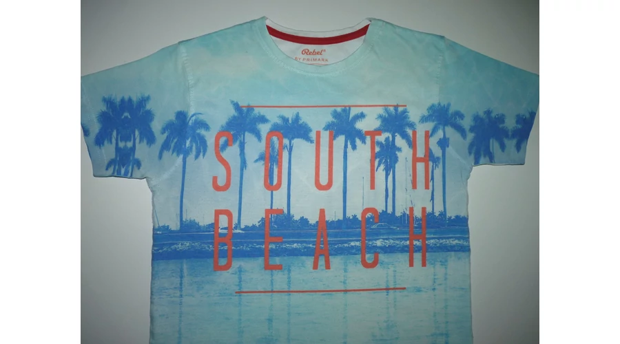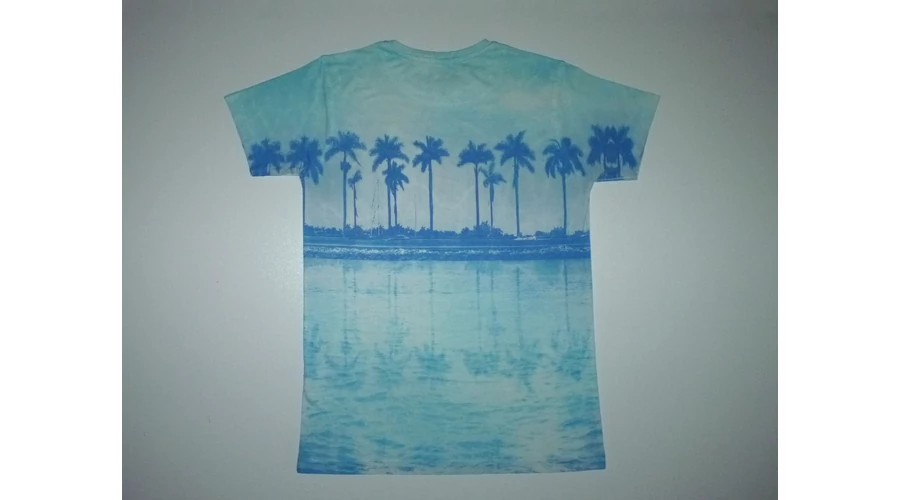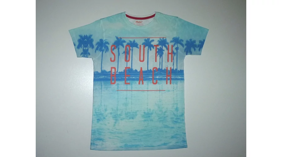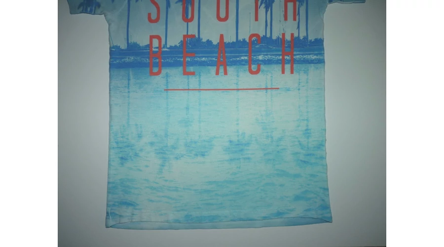 Puha rövid ujjú póló kerek nyakkal, pálmafás mintával, South Beach felirattal. Némi bolyhosodás, hátán egy függőleges halvány sárga csík (anyaghiba). Beleírt méret 11-12 év (152) |