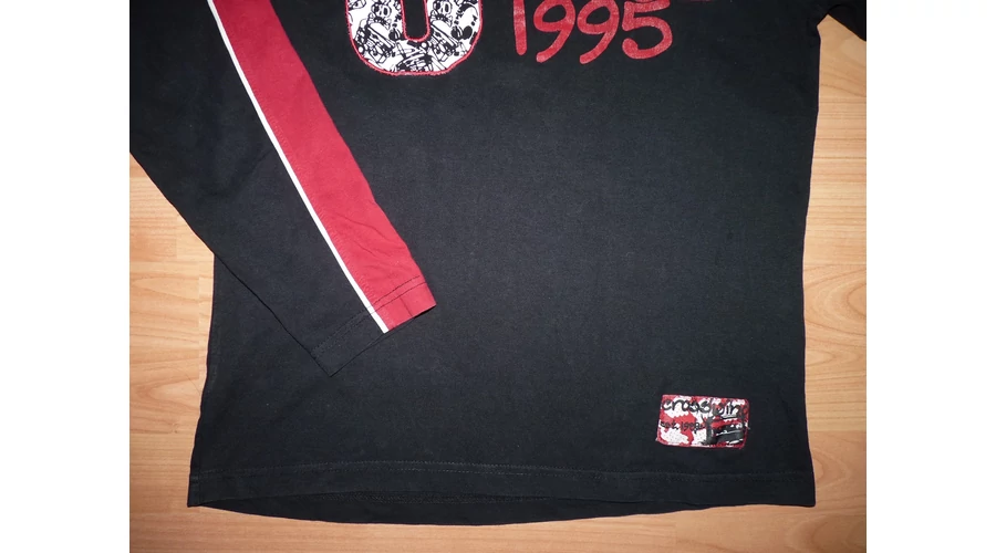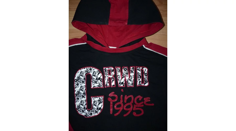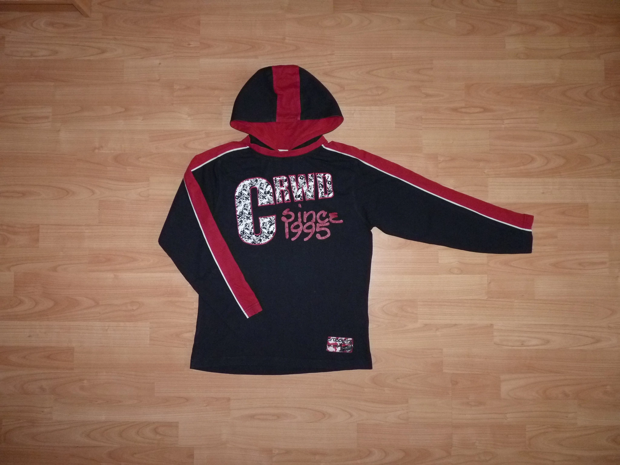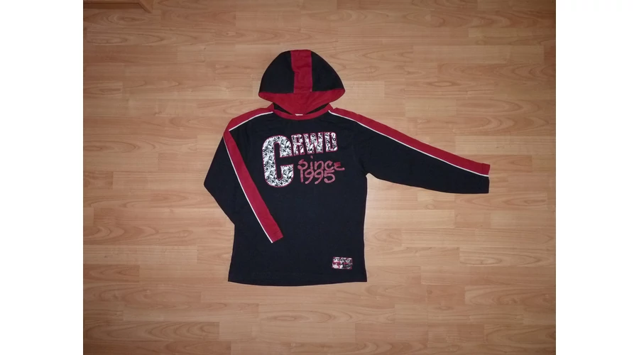Vagány, kellemes viseletű, hosszú ujjú pamut felső kapucnival, elején koponyás mintával. Jó minőségű és állapotú, a mintája minimálisan töredezett. (Fotó) Kényelmes. Beleírt méret 164. |
