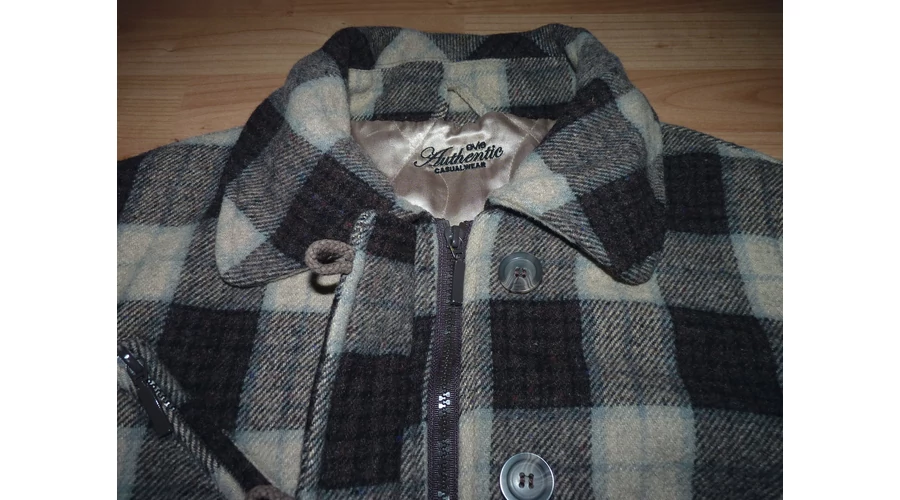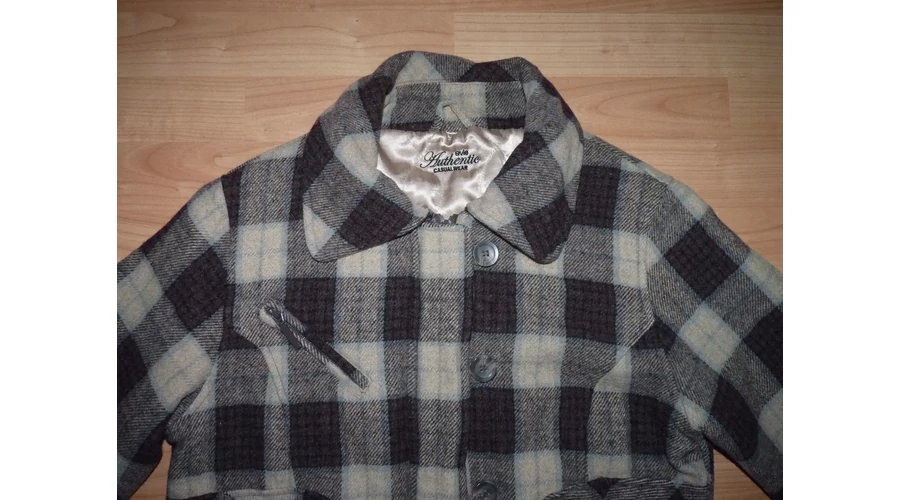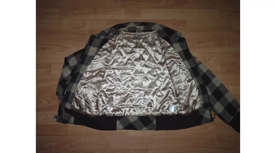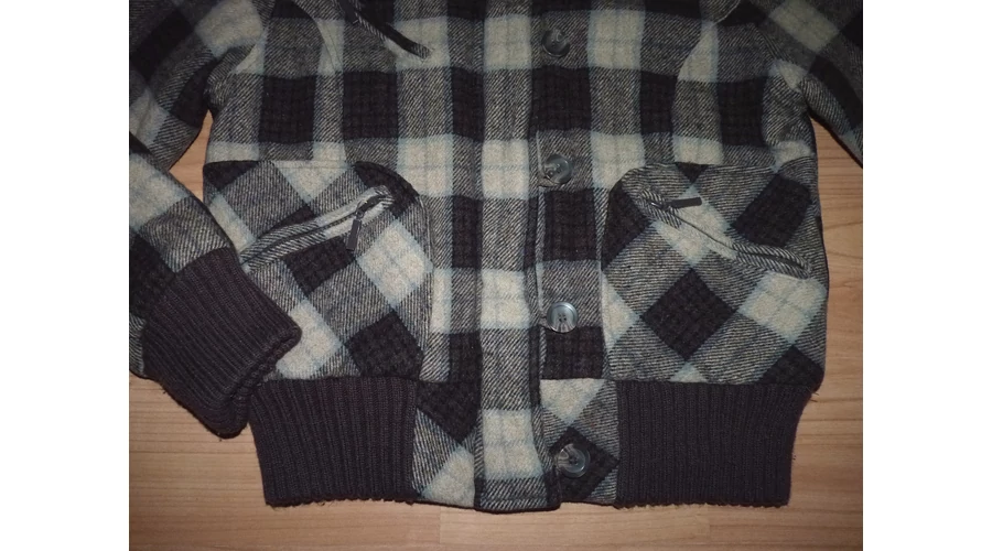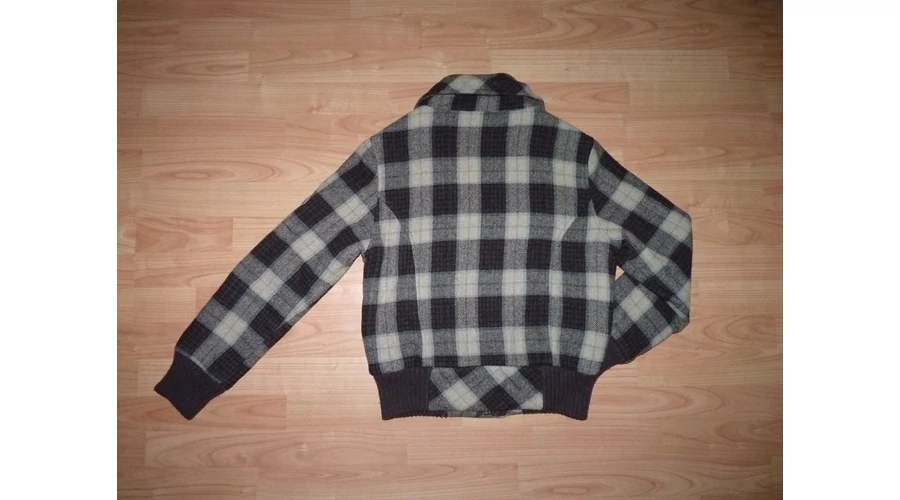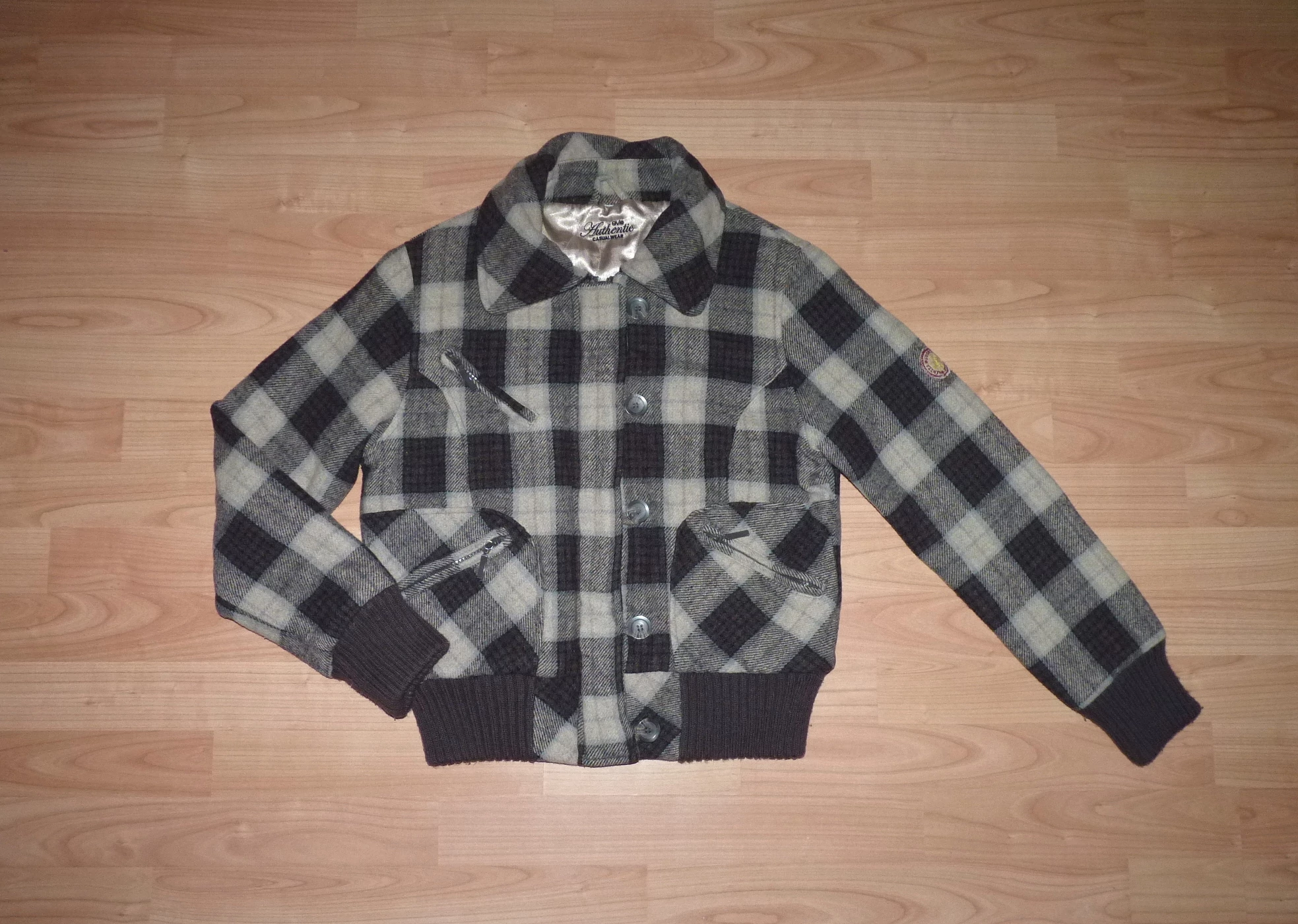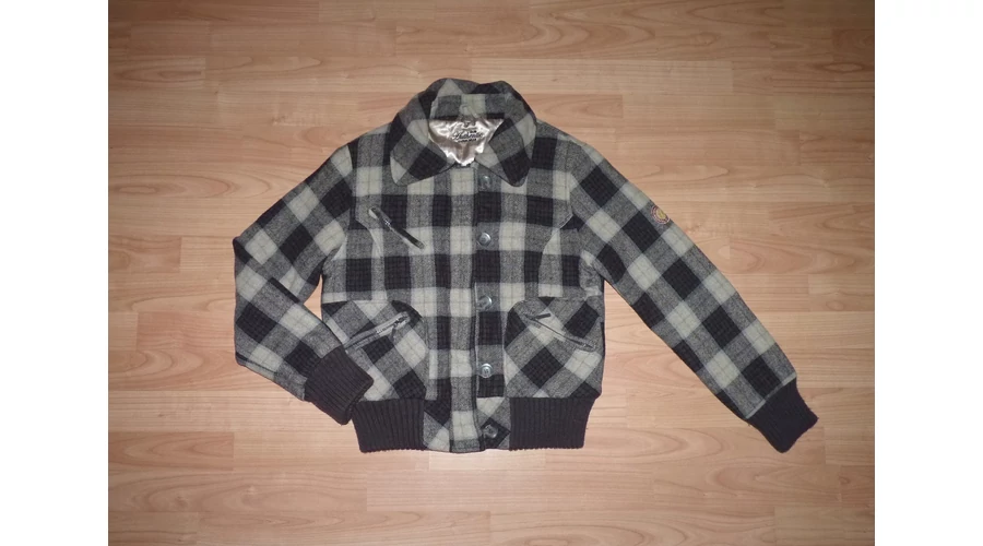 Csinos kockás szövet dzseki gallérral, elől cipzárral, előtte gombos szélvédő pánttal, egyik ujján rátéttel, cipzáros oldalzsebekkel és mellzsebbel, bordás passzés kézelővel és alsó szegéllyel, steppelt selyem béléssel. Jó állapotú, az alsó gombpánt megerősítve, rand részén némi bolyhosodás. Hűvösebb időben aláöltözhető. Beleírt méret 12. |