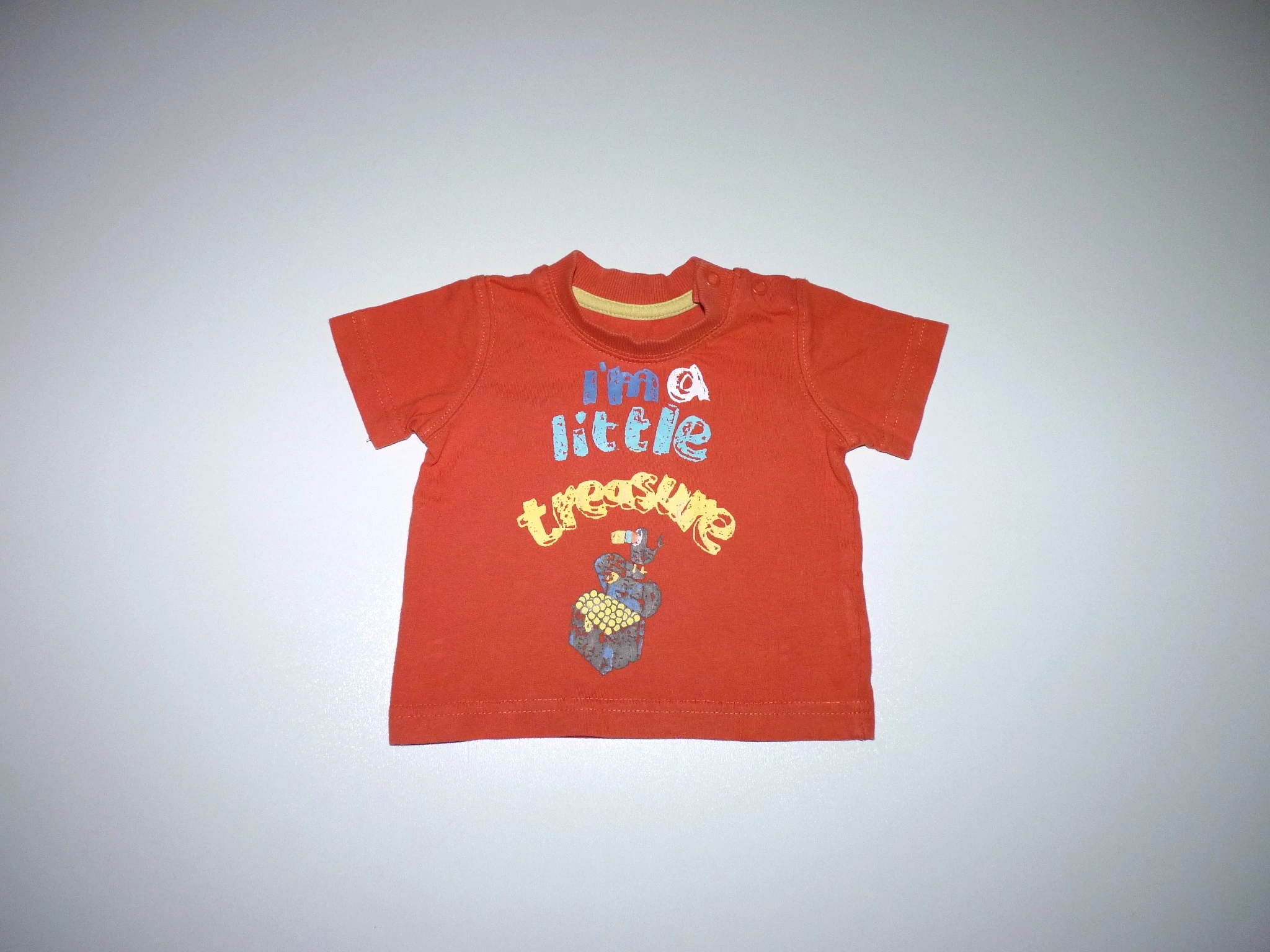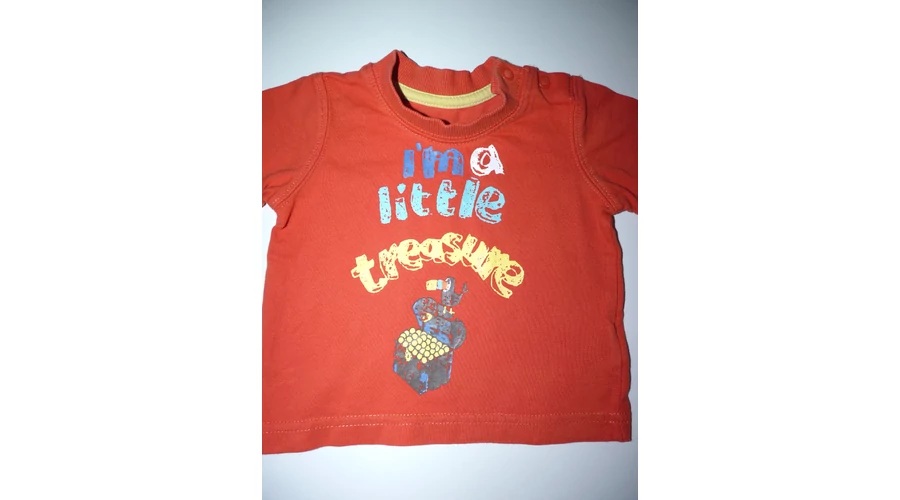 Kellemes viseletű pamut póló egyik vállán patentokkal, nyakán bordás passzéval, elején "I'am a little trasure" azaz "Kicsi Kincs vagyok" felirattal. Beleírt méret 4,5 kg. |