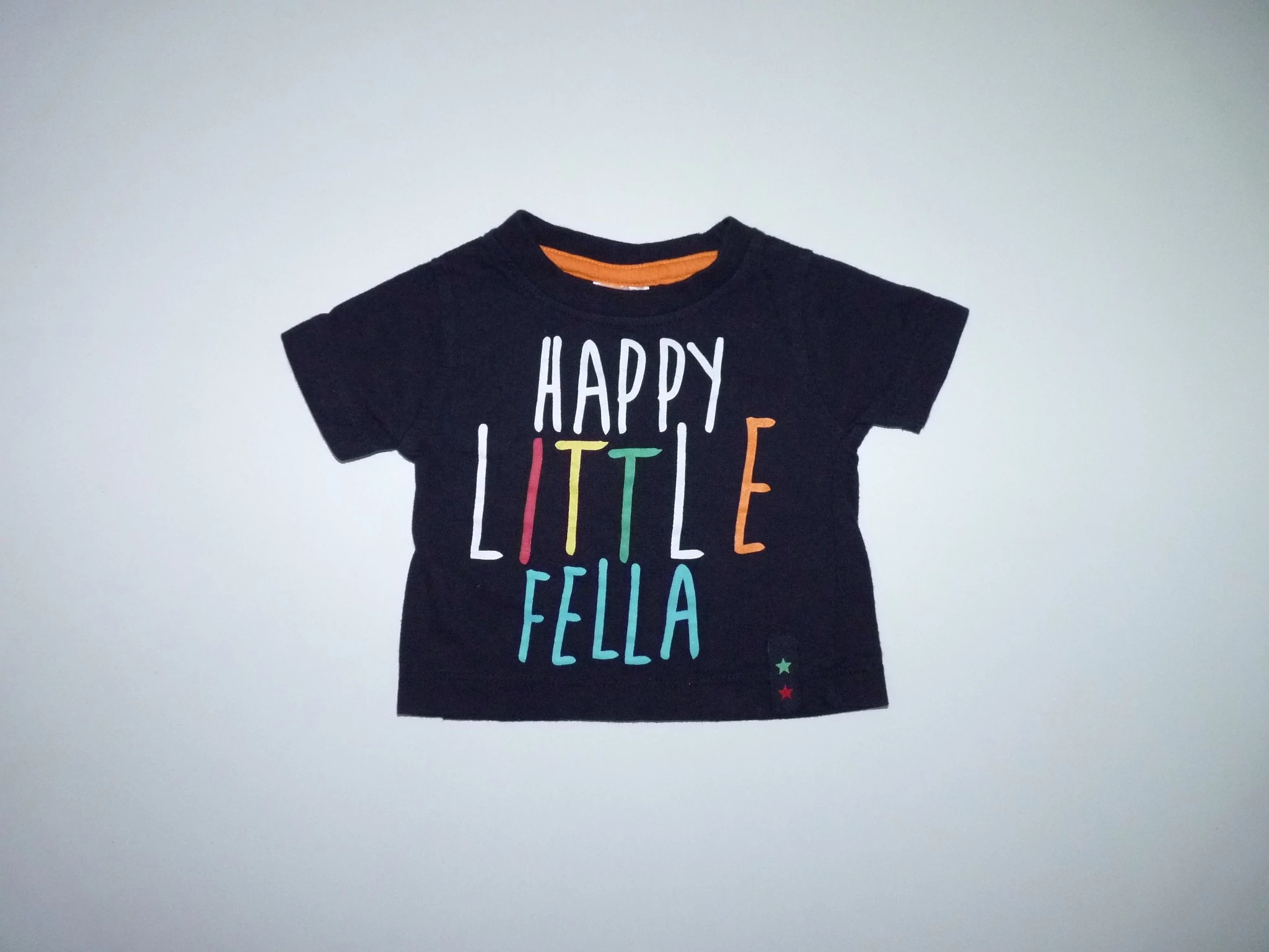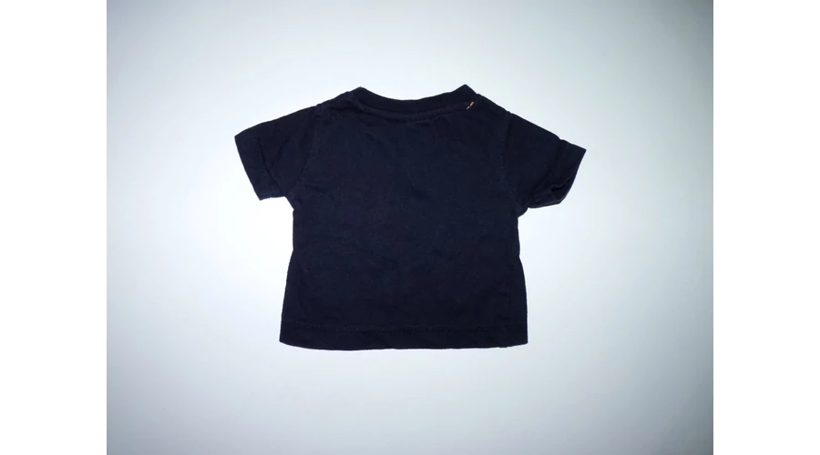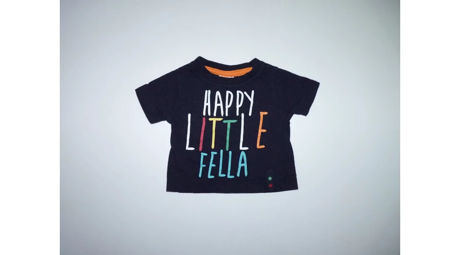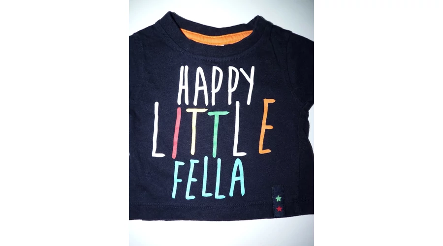 Sötétkék pamut póló, kerek bordás passzés nyakkal, elején színes, vidám felirattal, "Happy little fella" "Boldog kicsi fickó". Beleírt méret 0-3 hó. |