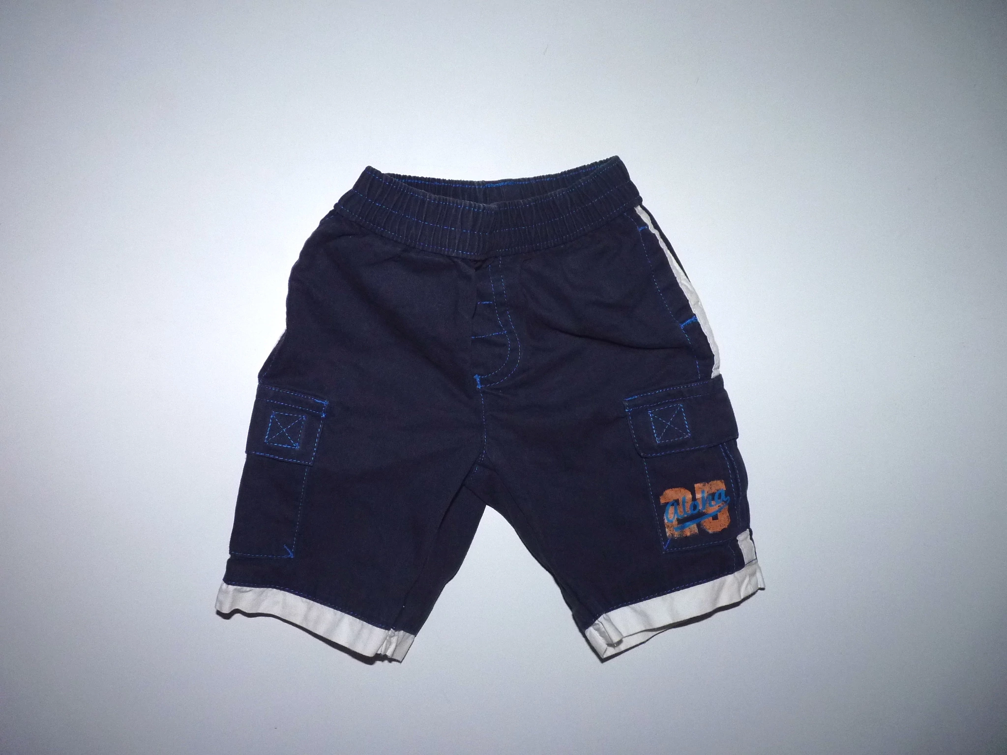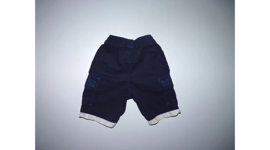 Sötétkék pamutkeverék rövidnadrág gumírozott derékkal, elején ál-sliccel, fehér szegéllyel, vagány tépőzáras oldalzsebbel, nyomott mintával. Beleírt méret 62. |