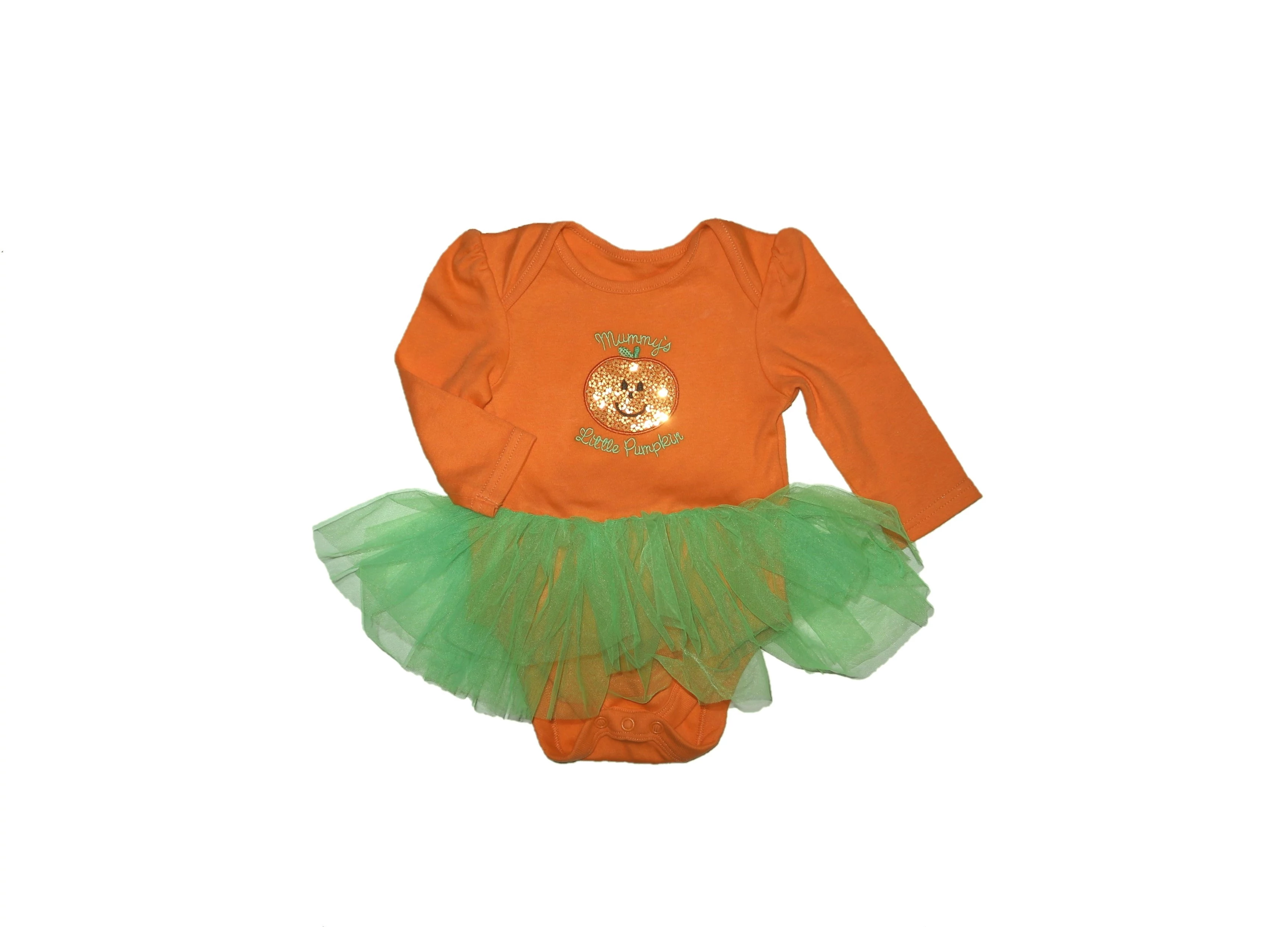Puha pamut body átlapolt, ráncolt vállal, patentos üleppel, hosszú ujjal, rávarrt, élénkzöld, kétrétegű tüll szoknyával, elején mosolygós, flitteres tök mintával. Szép állapotú. Beleírt méret 3-6 hó (62-68) |