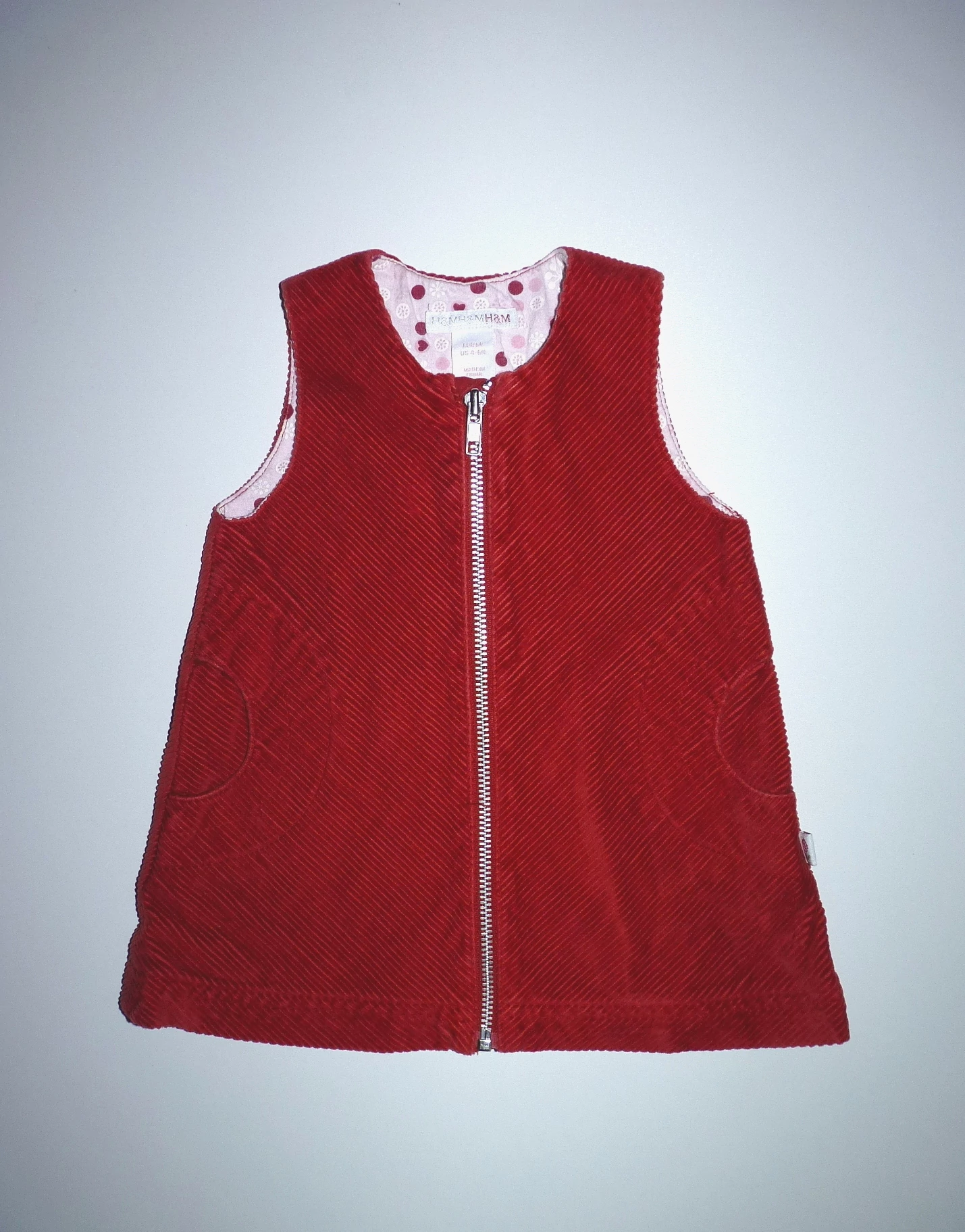 "A" vonalú, ujjatlan kordbársony ruha elől cipzárral, pamut béléssel, két oldalzsebbel. Beleírt méret 4-6 hó (68) |