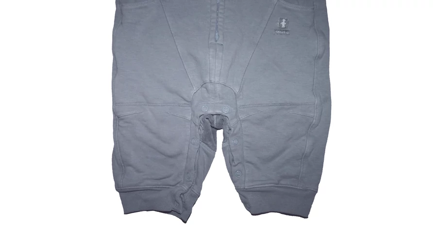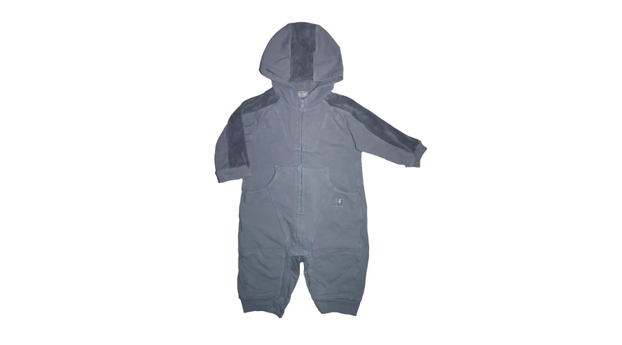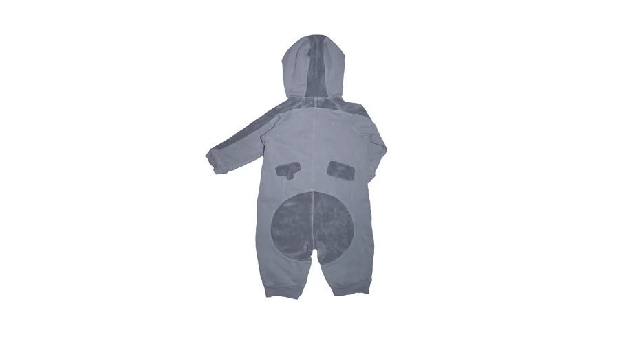 Egyberészes, pamutkeverék overál kapucnival, bordás passzés kézelővel és alsó szegéllyel, elején cipzárral, lábközépen patentokkal, kenguruzsebbel, vagány, puha, bársony foltmintákkal, bolyhozott fonákkal. Beleírt méret 6 hó. |
