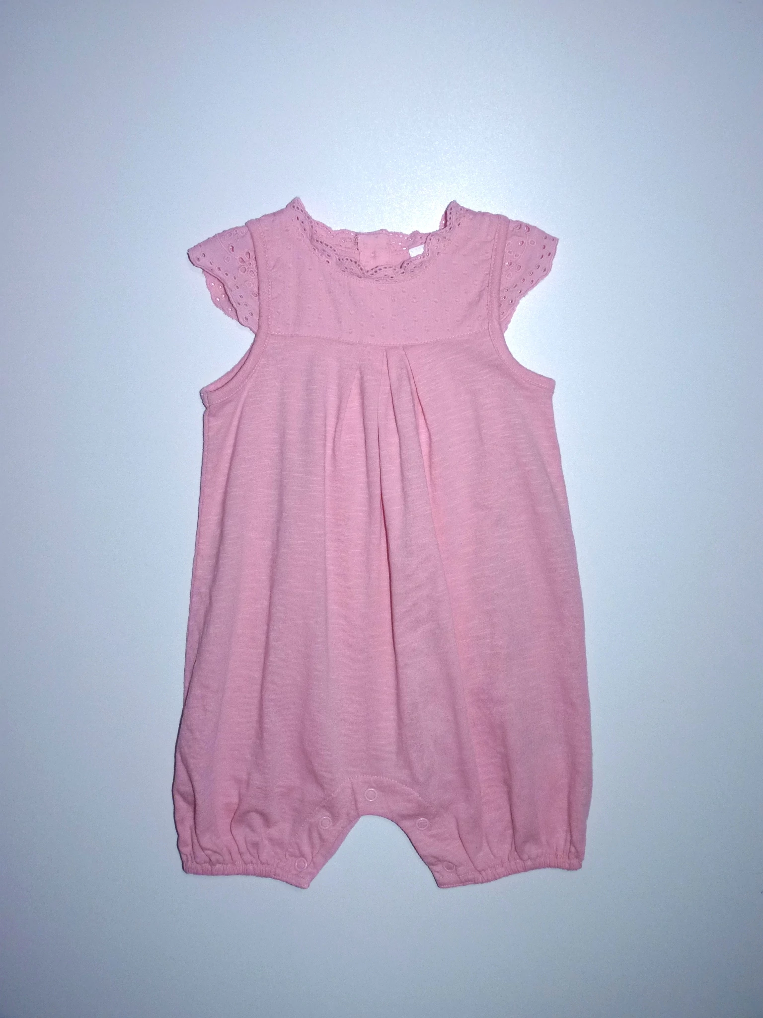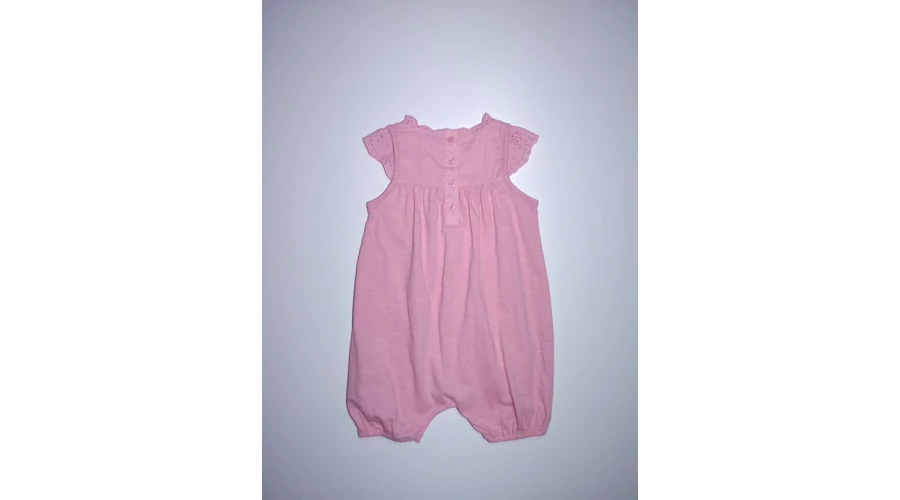 Csodaszép, puha pamut playsuit azsúrozott pillangóujjal és nyakkal, mintás vállrátéttel, nyaki hátsó részén gombokkal, szárvégén laza gumírozással, ülepén patentolással. Nagyon jó állapotú. Beleírt méret 6-9 hó. |