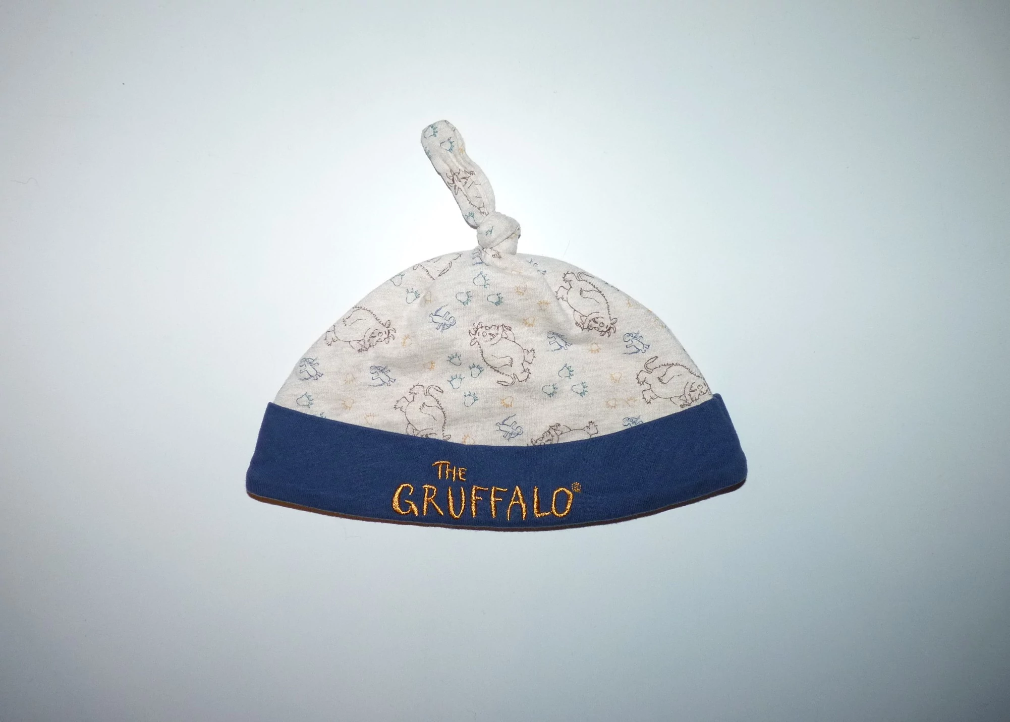 Tündéri pamut sapka. Drapp-kék színű, The Gruffalo mintával. Puha, kellemes viseletű, pamut anyagú. Nagyon jó állapotú. Beleírt méret 6-9 hó (68-74)Alsó átmérője (az alsó karimánál mérve): 20-24 cmx2Tetejétől az aljáig a hossza elől: 14 cm |