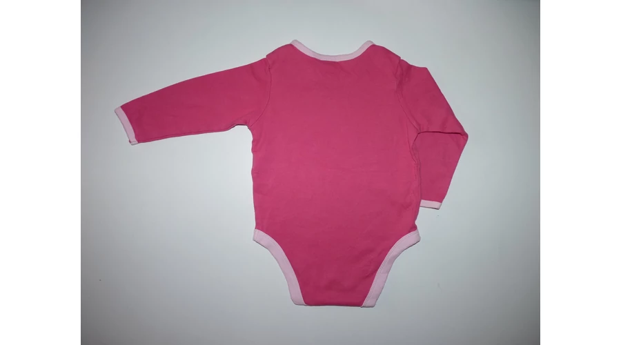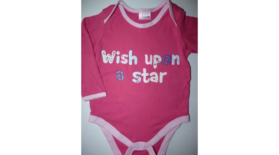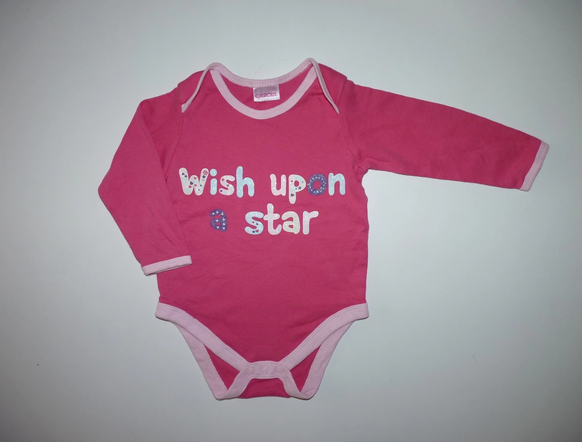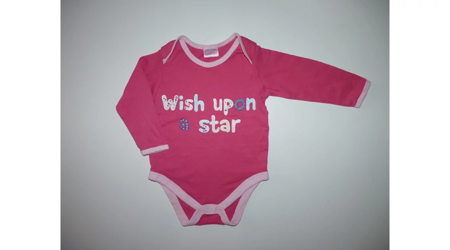 Kellemes viseletű, erős rózsaszín színű pamut body, elején csillogós "Wish upon a star" felirattal. Kényelmes, jó állapotú. Beleírt méret 6-9 hó (74) |