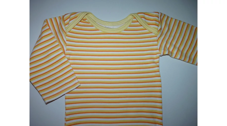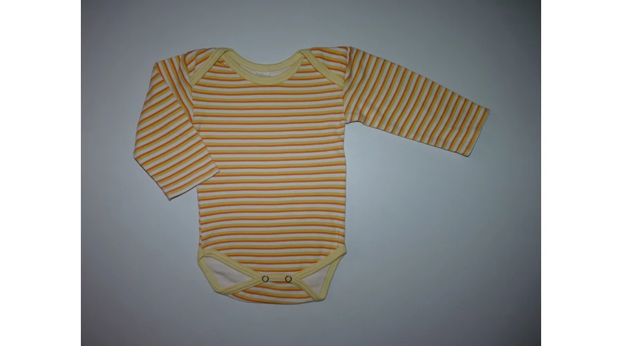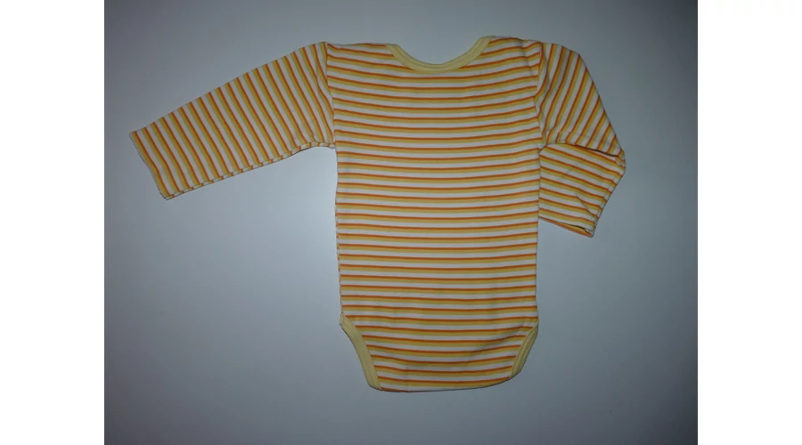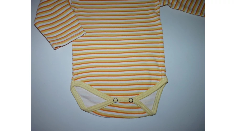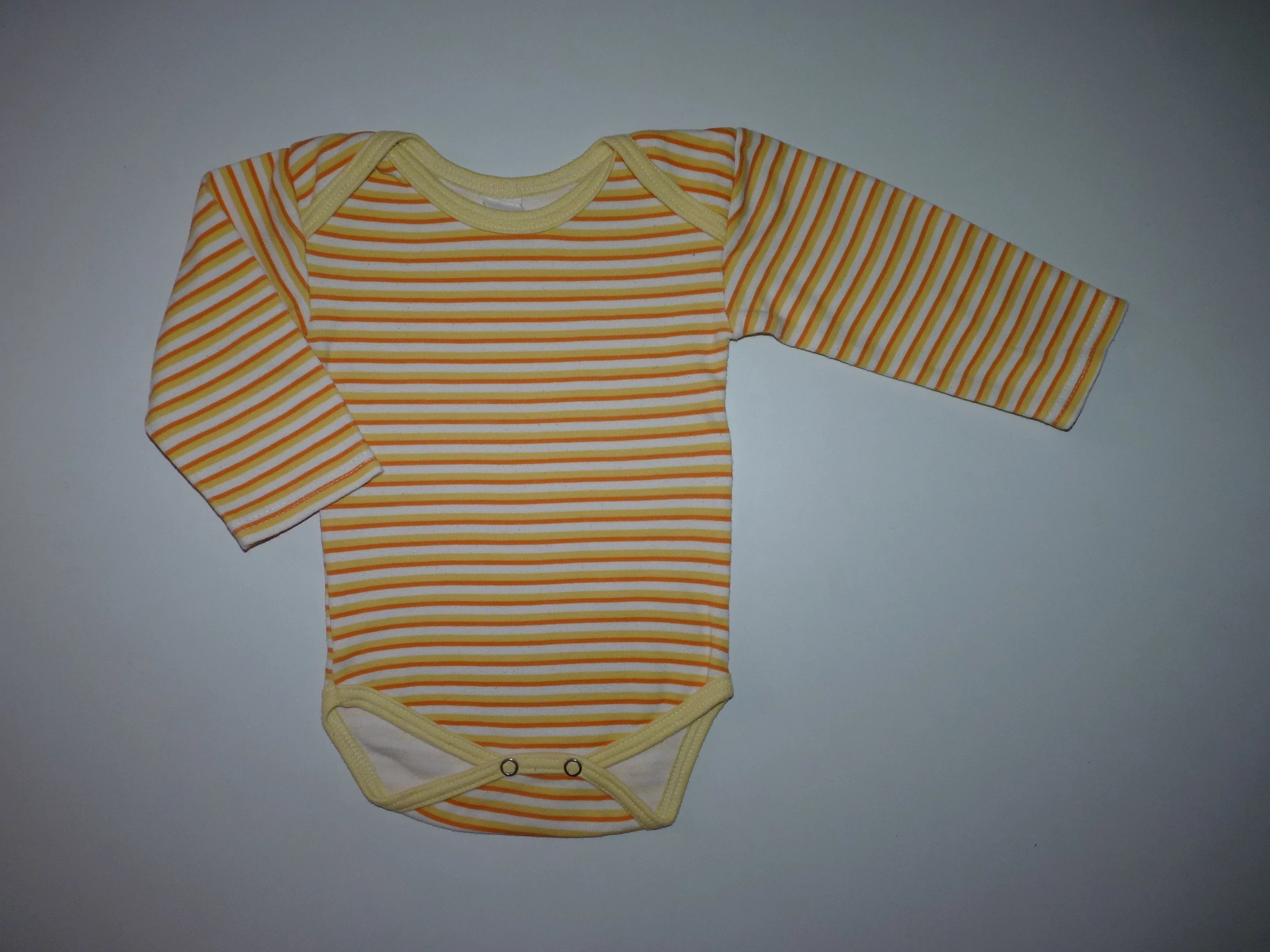 | Hosszú ujjú, pamutkeverék body patentos üleppel átlapolt vállal. Fehér-narancs-citromsárga csíkos. Jó állapotú, némi bolyhosodás. Beleírt méret nem látszik. Magyar termék. | |