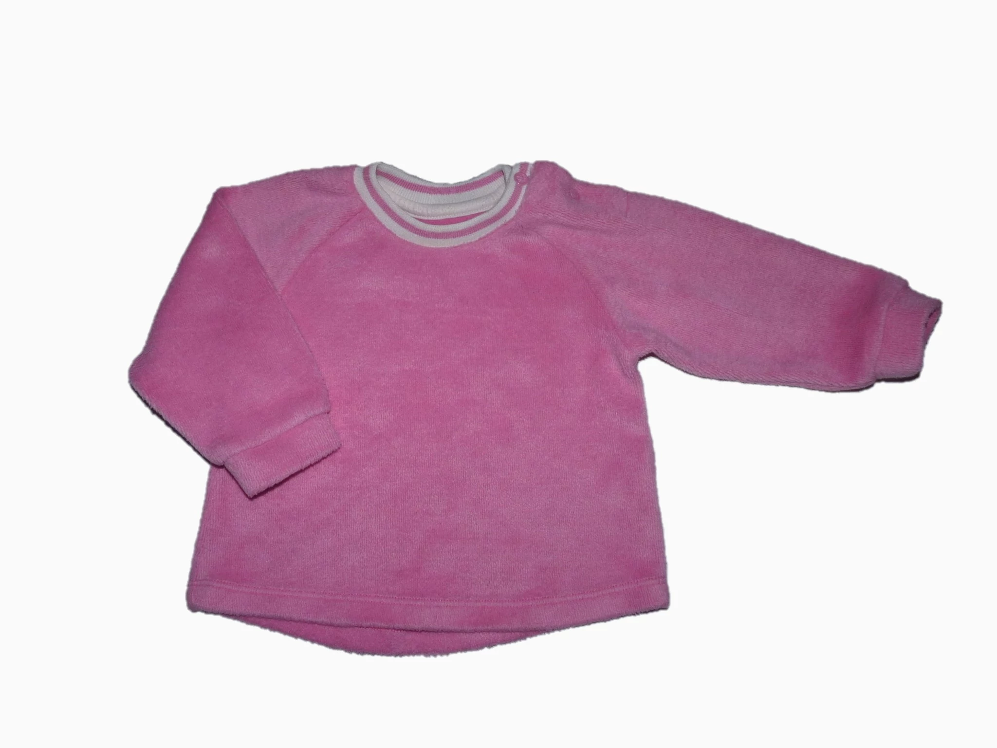 Puha, plüssös melegítőfelső hosszú raglánujjal, egyik vállán patentokkal, nyakán csíkos bordás passzéval. Jó állapotú. Beleírt méret 6-9 hó (74) |