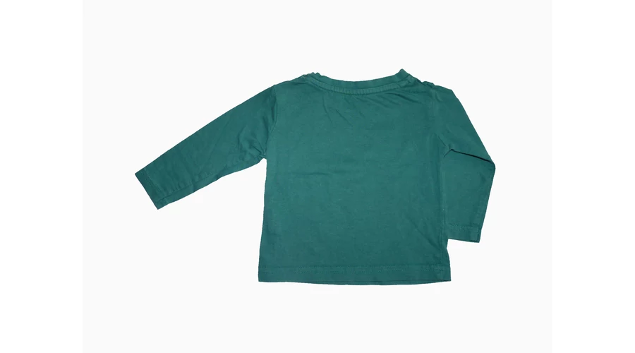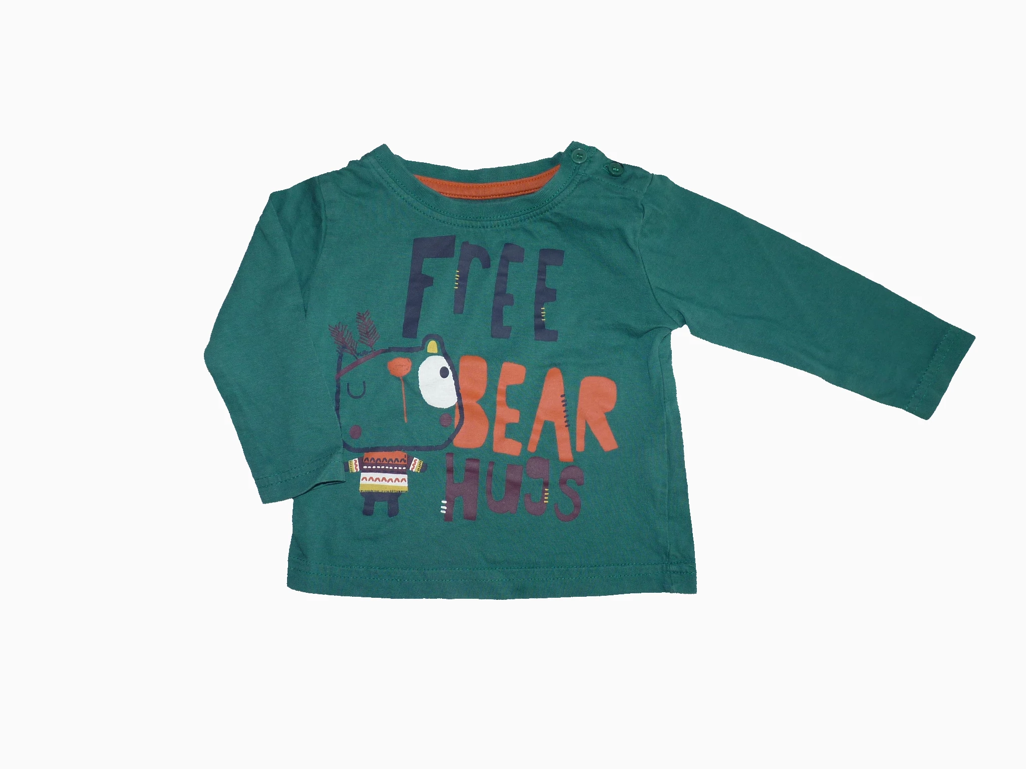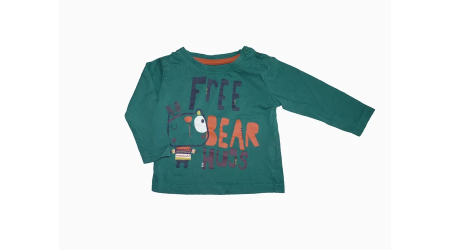 Tündéri zöld pamut felső, elején aranyos indiános macival, és felirattal. Jó állapotú, nyakán gombok segítik az öltöztetést. Beleírt méret 6-9 hó (74) |