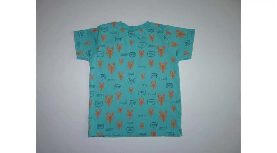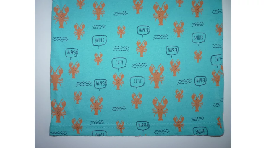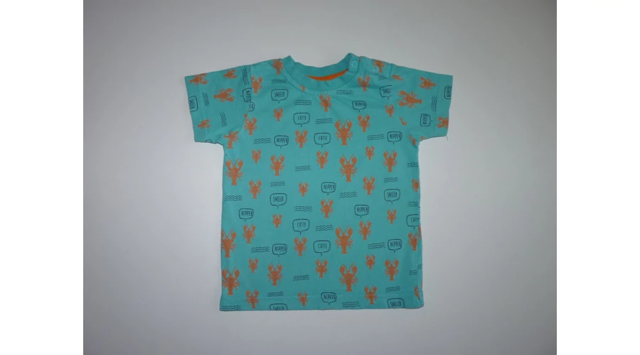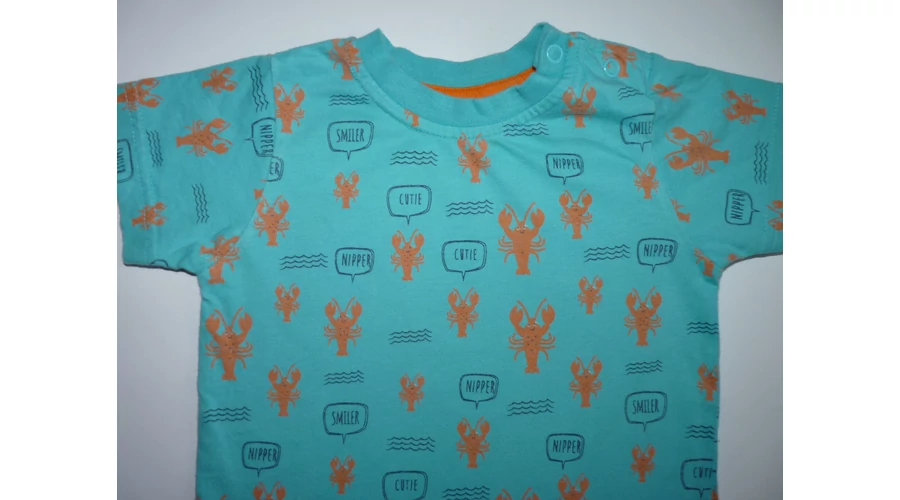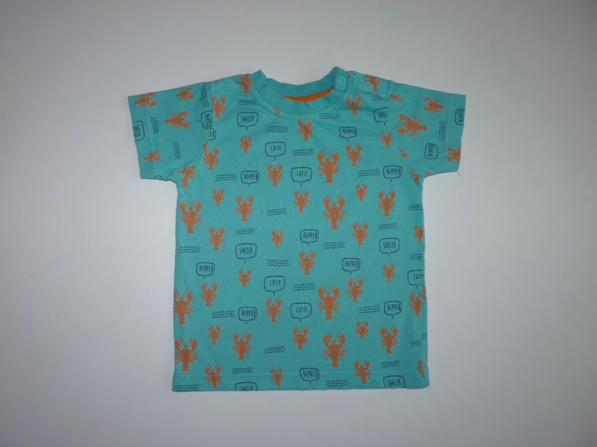 Kellemes viseletű, kék alapszínű pamut póló. Mosolygó rákocskák, víz és feliratok díszítik. Nyakánál két patent segíti az öltöztetést. Jó állapotú. Beleírt méret 9-12 hó (74-80) |