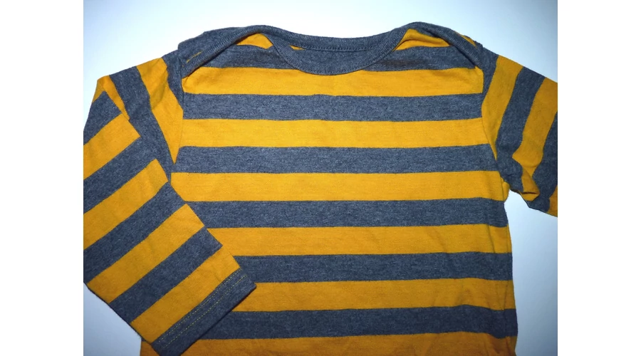 Puha pamut felső hosszú ujjal, átlapolt vállal, mustársárga-szürke csíkokkal. Beleírt méret 9-12 hó (76 cm) |