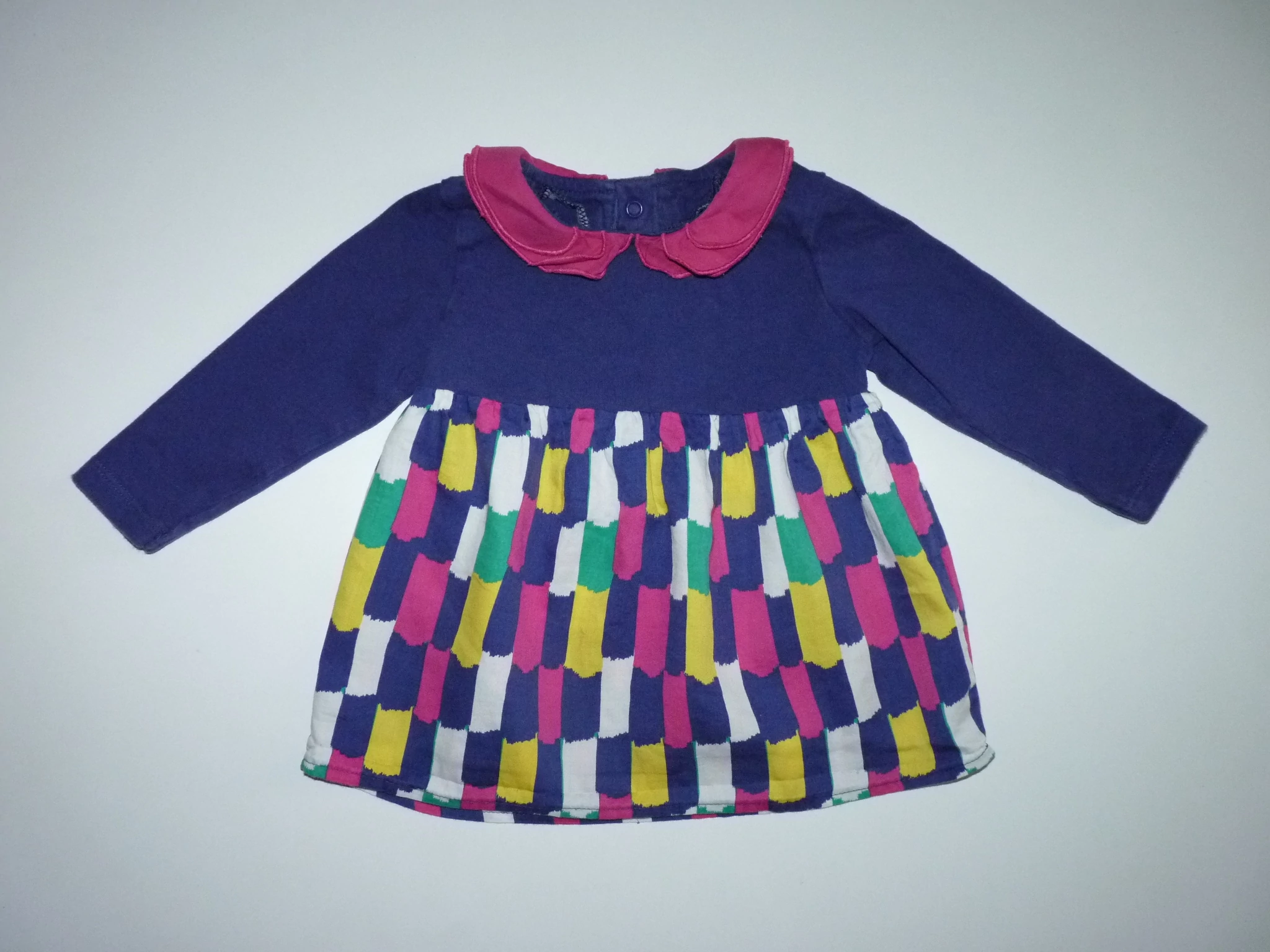 Kellemes viseletű pamut kislány ruha. Lila alapszínű, alsó része vidám, színes, nyakán ciklámen fodros. Hátul patentok segítik az öltözködést. Jó állapotú. Beleírt méret 9-12 hó (76) |