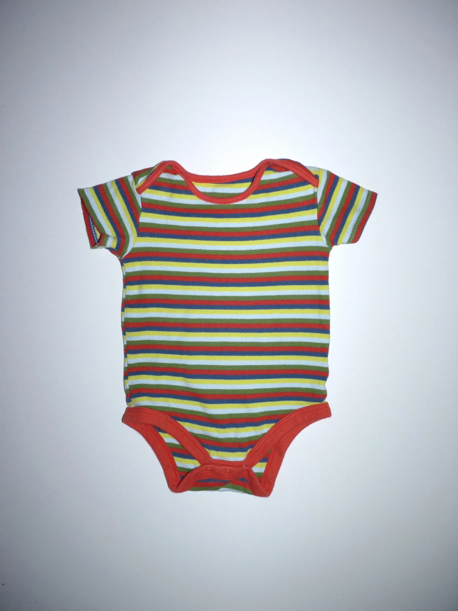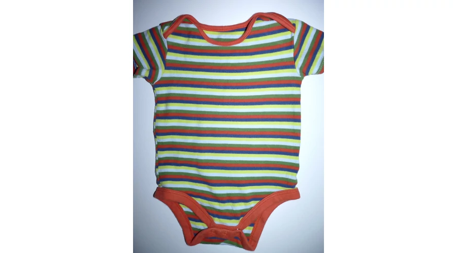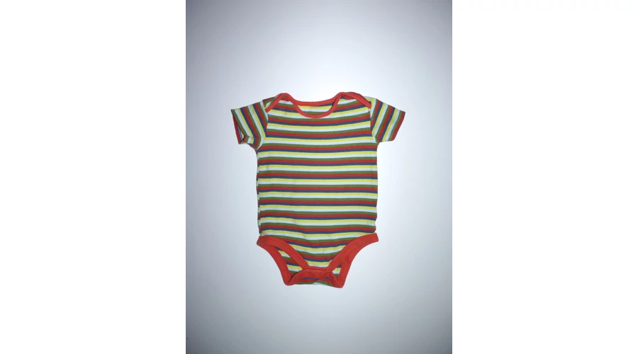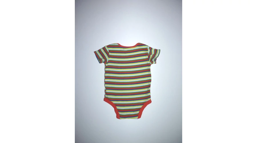 Puha pamut body átlapolt vállal, rövid ujjal, patentos üleppel, színes csíkokkal és narancs szegéllyel. Jó állapotú, némi bolyhosodás. Beleírt méret 9-12 hó (74-80cm). |