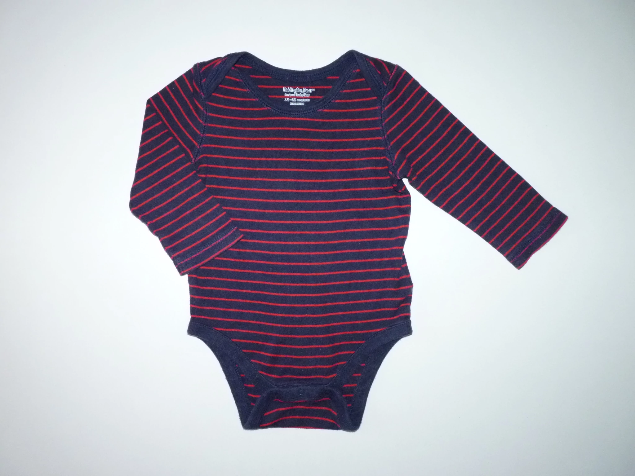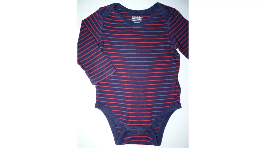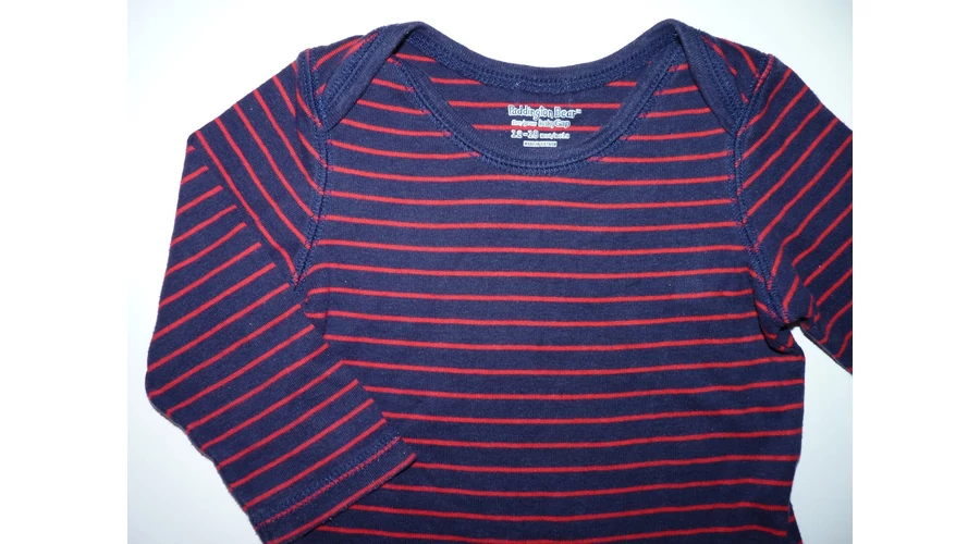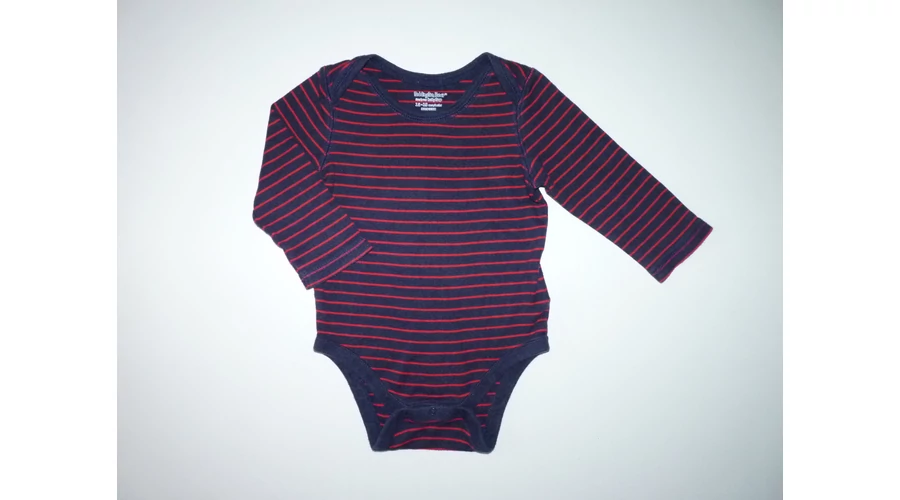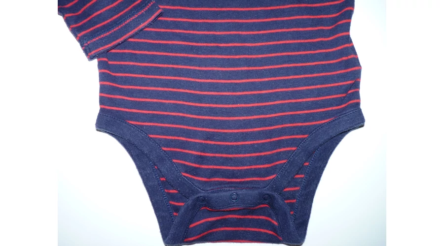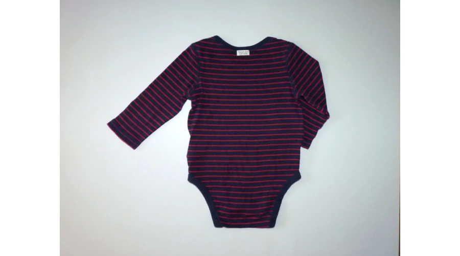 Kellemes viseletű pamut body. Sötétkék alapszínű, piros csíkos, divatos kifordított varratos vállal. Jó állapotú, minimális bolyhosodás felfedezhető. Beleírt méret 12-18 hó (80) |
