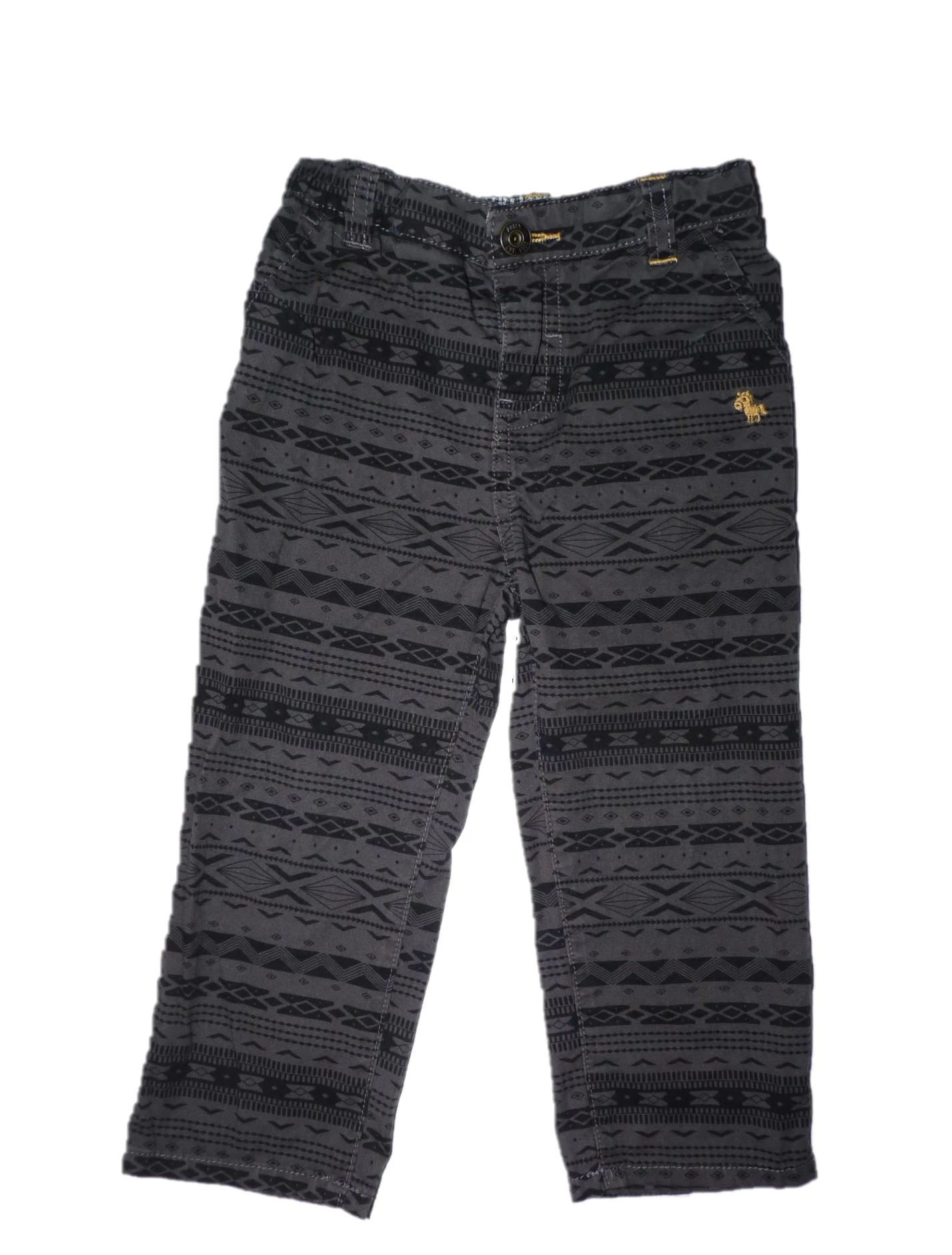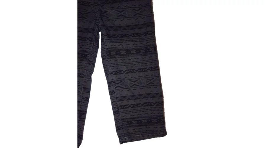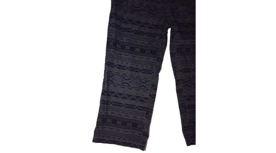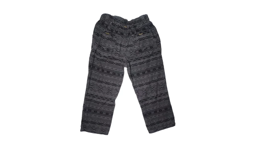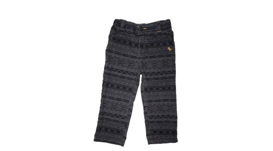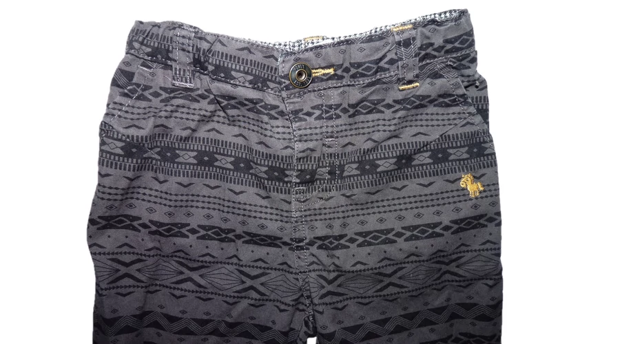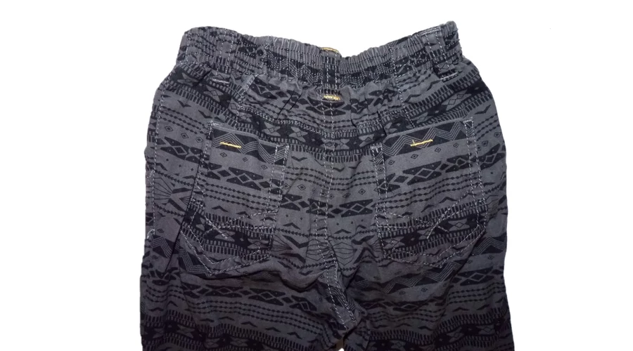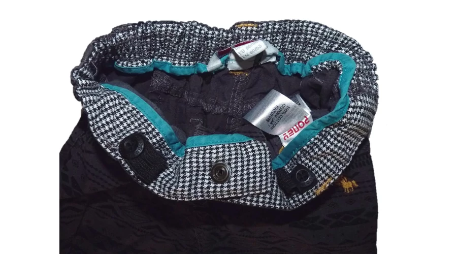 Pamutszövet fiú nadrág vagány fekete mintával, állítható gumírozott derékkal, kapcsos sliccel, elöl és hátul zsebekkel, derekán övbújtatókkal. Bal zseb alatt kis hímzett póni. Nagyon jó állapotú. Beleírt méret 80/86. |