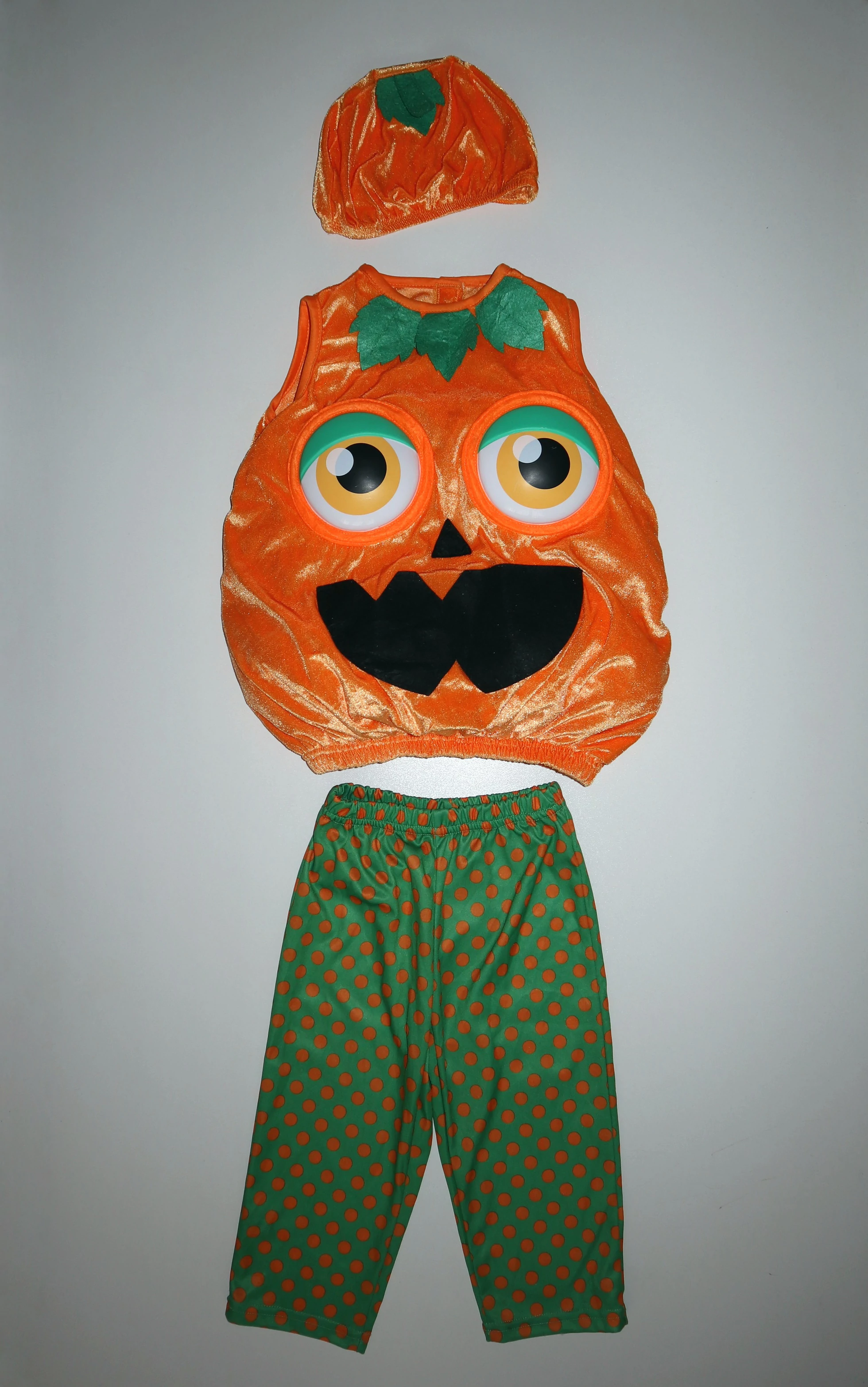 Három részes tök jelmez. Narancssárga, ujjatlan, hastömött tök felső nyakán zöld "levelekkel", elején nagy műanyag szemekkel, nyaki hátsó részén tépőzárral, gumírozott alsó résszel. Tartozik hozzá egy rikítózöld narancs pöttyös nadrág, és hozzá illő "tökfödő" sapka. Beleírt méret 1-2 év. |