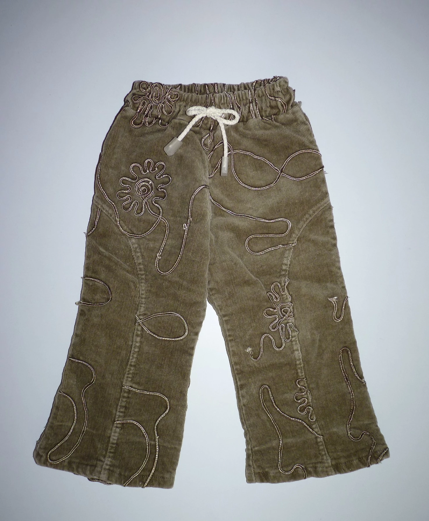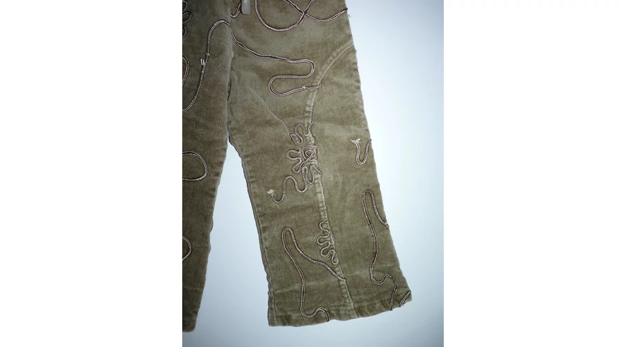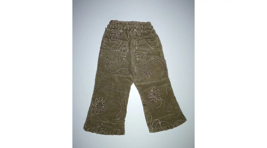 Kellemes viseletű, pamut bélelt kislány nadrág. Kényelmes gumis derekú, mely kötővel is állítható. Zöldes árnyalatú, mikrokord anyagú, melyet fényes szalagos minta tesz különlegessé. Használt, de jó állapotú, a szalagon néhol szálhúzódás, de nem feltűnő. (Fotó). Szuper viselet hűvösebb időben. Beleírt méret 86. |