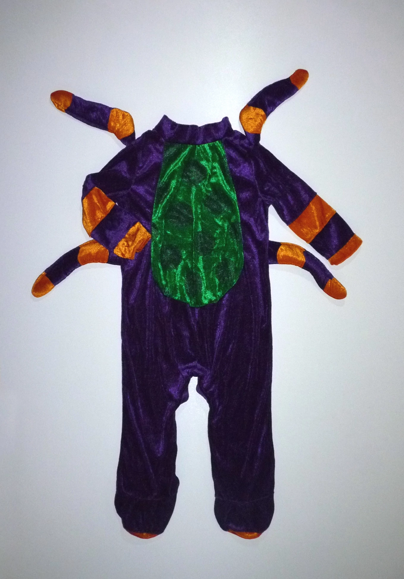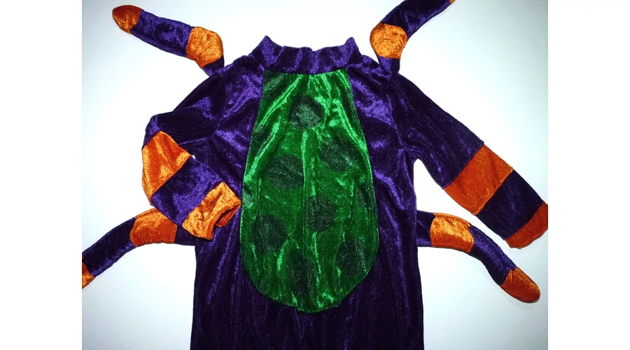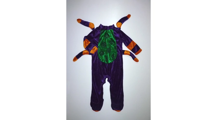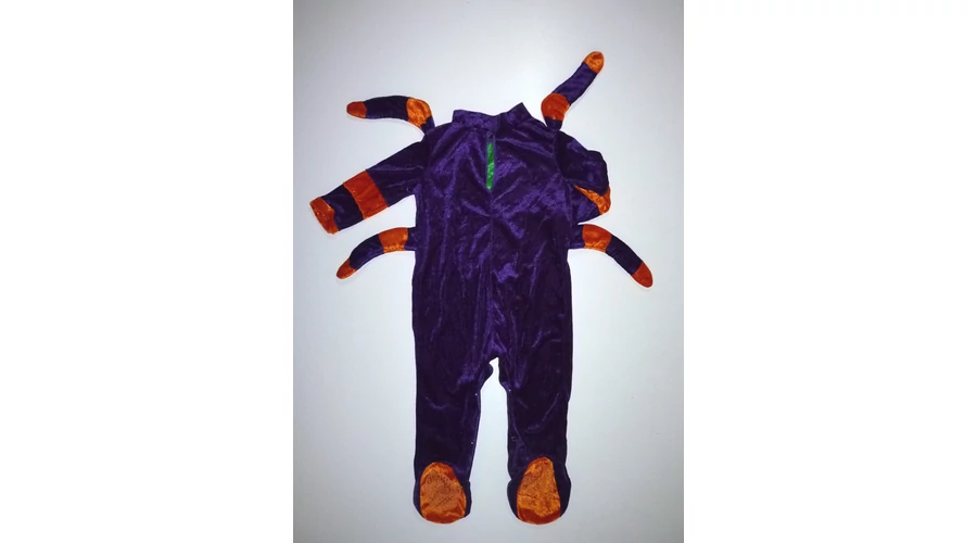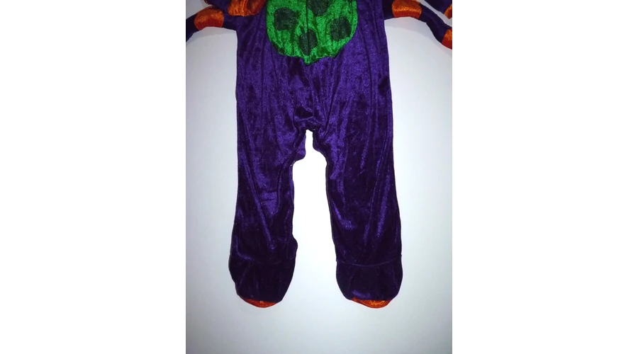 Puha, lábfejes színes pók jelmez nyaki hátsó részén tépőzárral, lábközépen patentokkal a könnyebb pelenkázásért, talpán csúszásgátlókkal, vagány pók karokkal. Szép állapotú, talpán a csúszásgátlón látszik kissé a használat. Beleírt méret M. InCharacter mérettáblázat szerint 12-18 hó. |