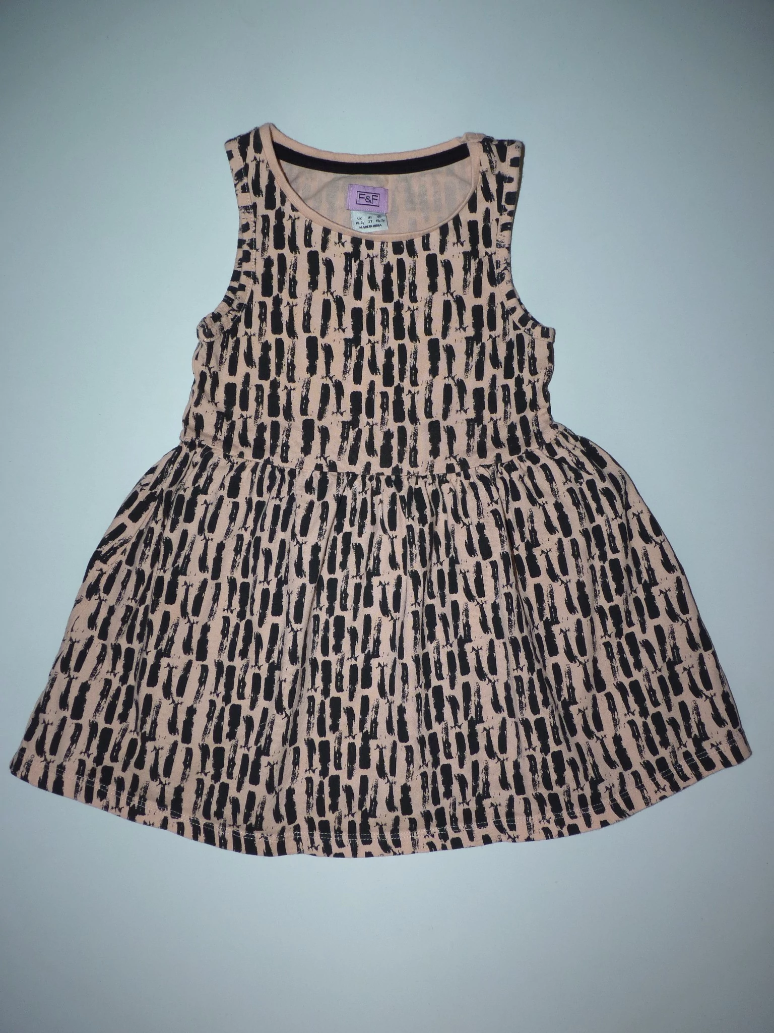 Csinos kislány ujjatlan ruha. Kellemes viseletű, pamut anyagú, lenge, ujjatlan, deréknál ráncolt. Nagyon jó állapotú. Szuper viselet bölcsibe/oviba, alkalmakra, nyári ruhaként vagy egy felsővel. Beleírt méret 1 1/2 - 2 év (92) |