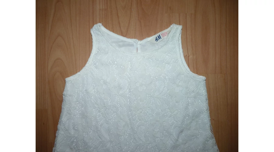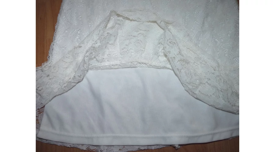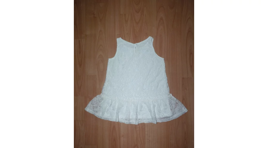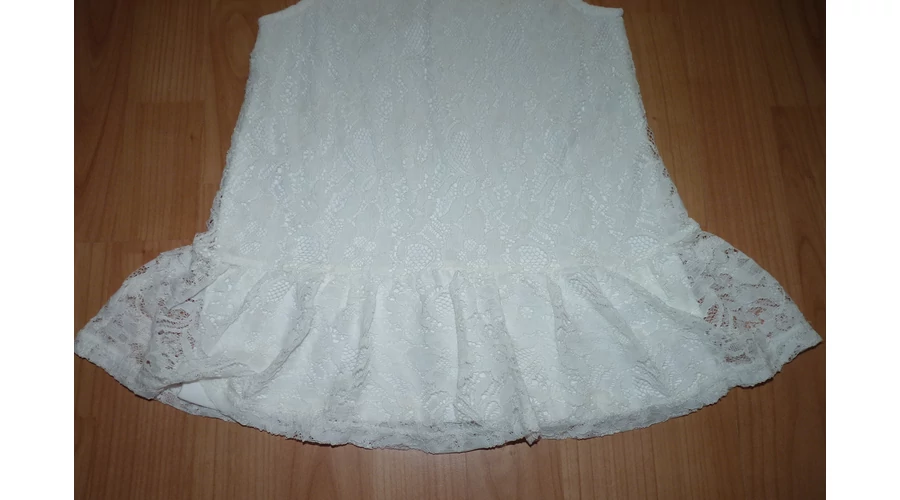 Ujjatlan, finom, természetes fehér csipkeruha nyaki hátsó részén kis, gombos nyílással, alján bővülő fodorral, puha vékony alsószoknyával. Újszerű állapotú. Beleírt méret 1 1/2 - 2 év (92) |