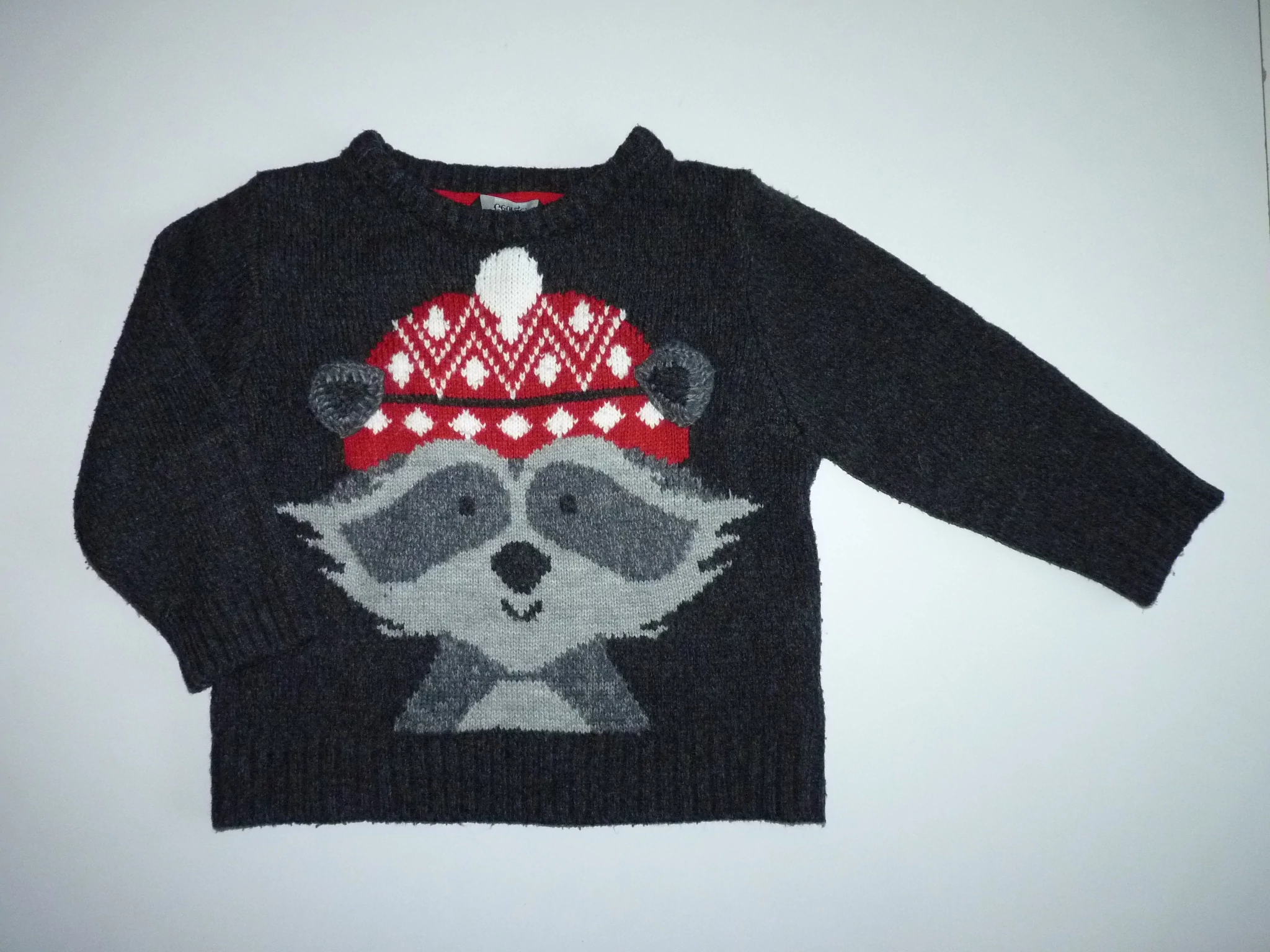 Kellemes viseletű, sötétszürke alapszínű kötött pulóver. Elején tündéri mosómedve piros sapkában. Szuper viselet ősszel/télen, akár az ünnepekre való hangolódáshoz is. Beleírt méret 2-3 év (92-98) |
