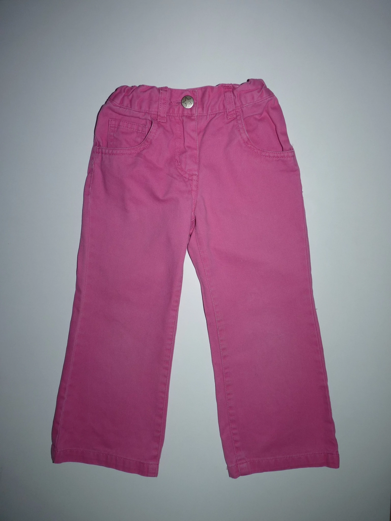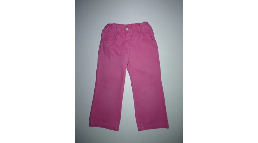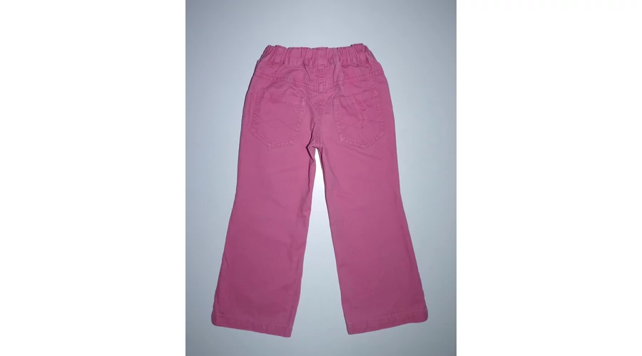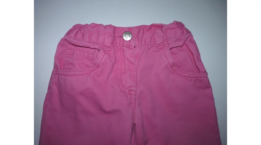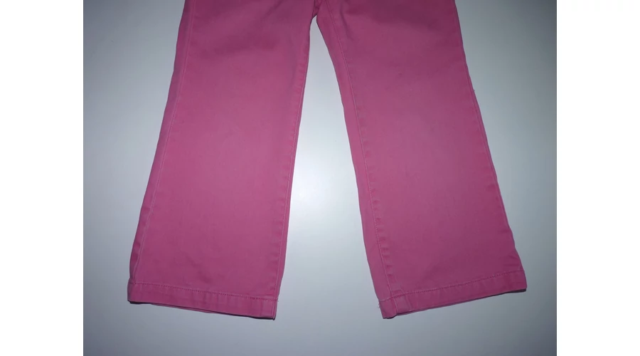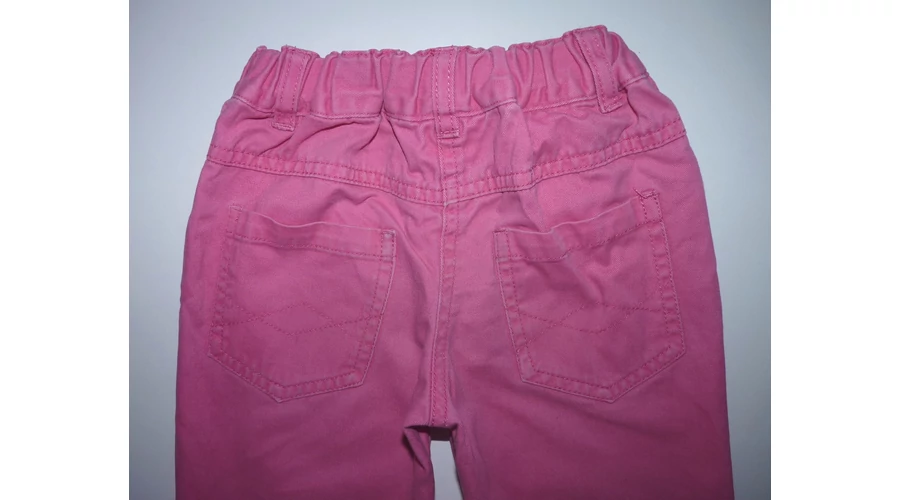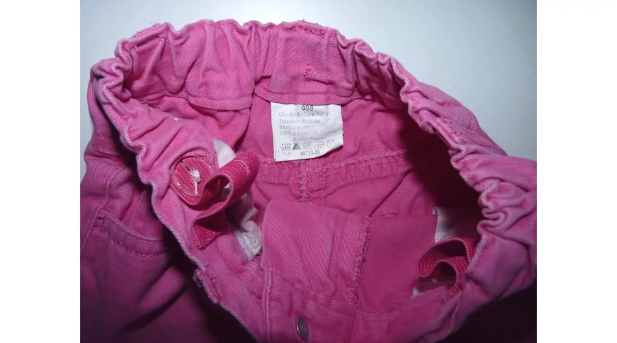Puha, ötzsebes rózsaszín kislány nadrág állítható gumírozott derékkal, gombos-cipzáros sliccel, övbújtatókkal. Jobb lábszárán két apró szálhúzódás, térdnél kis halvány foltok. Beleírt méret 98. |