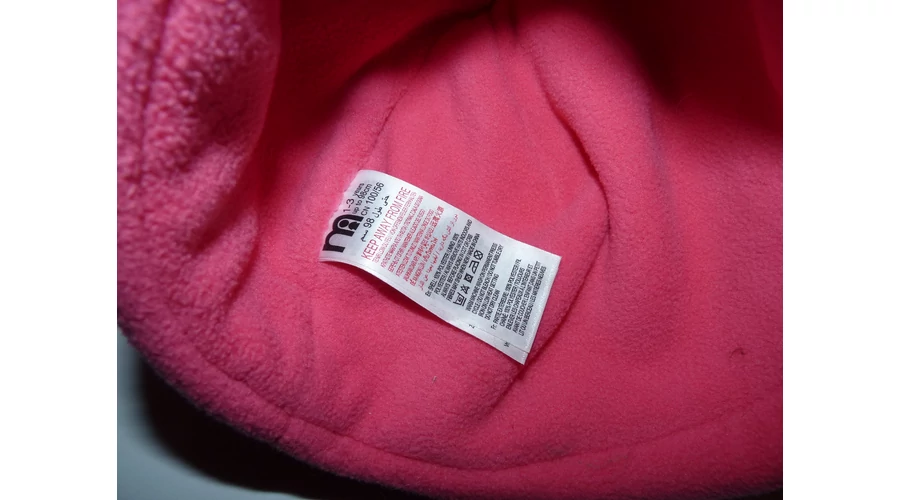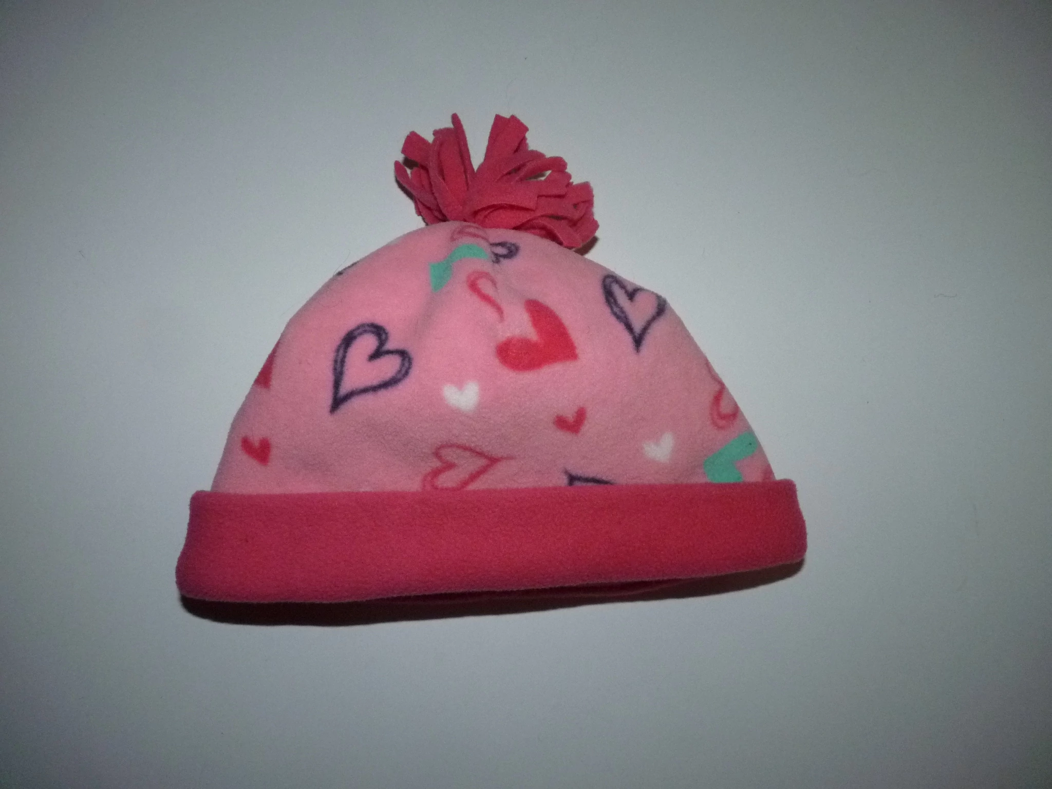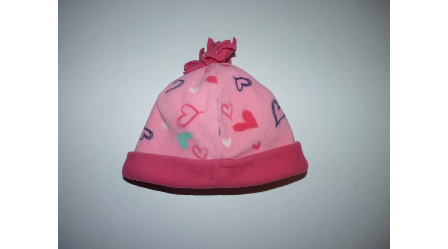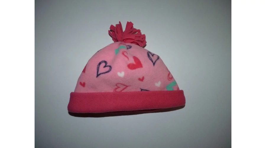Kellemes viseletű, puha polár sapka. Rózsaszín, tündéri szívecskés mintával, tetején bojttal. Beleírt méret 98.