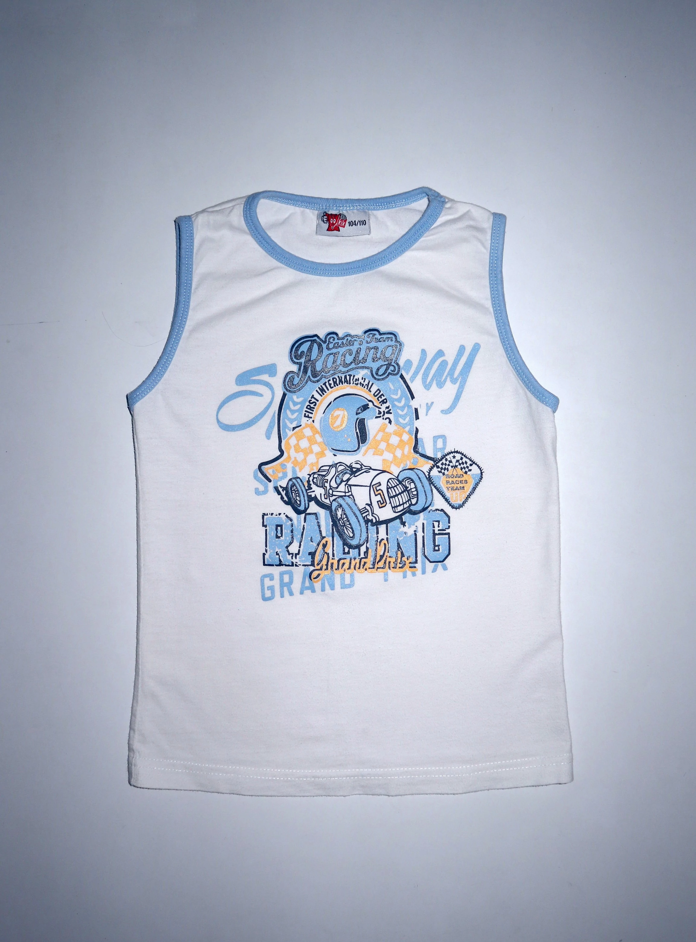 Ujjatlan pamut felső kerek nyakkal, kontrasztos színű szegéllyel, elején vagány versenyautós mintával. Beleírt méret 104/110. |