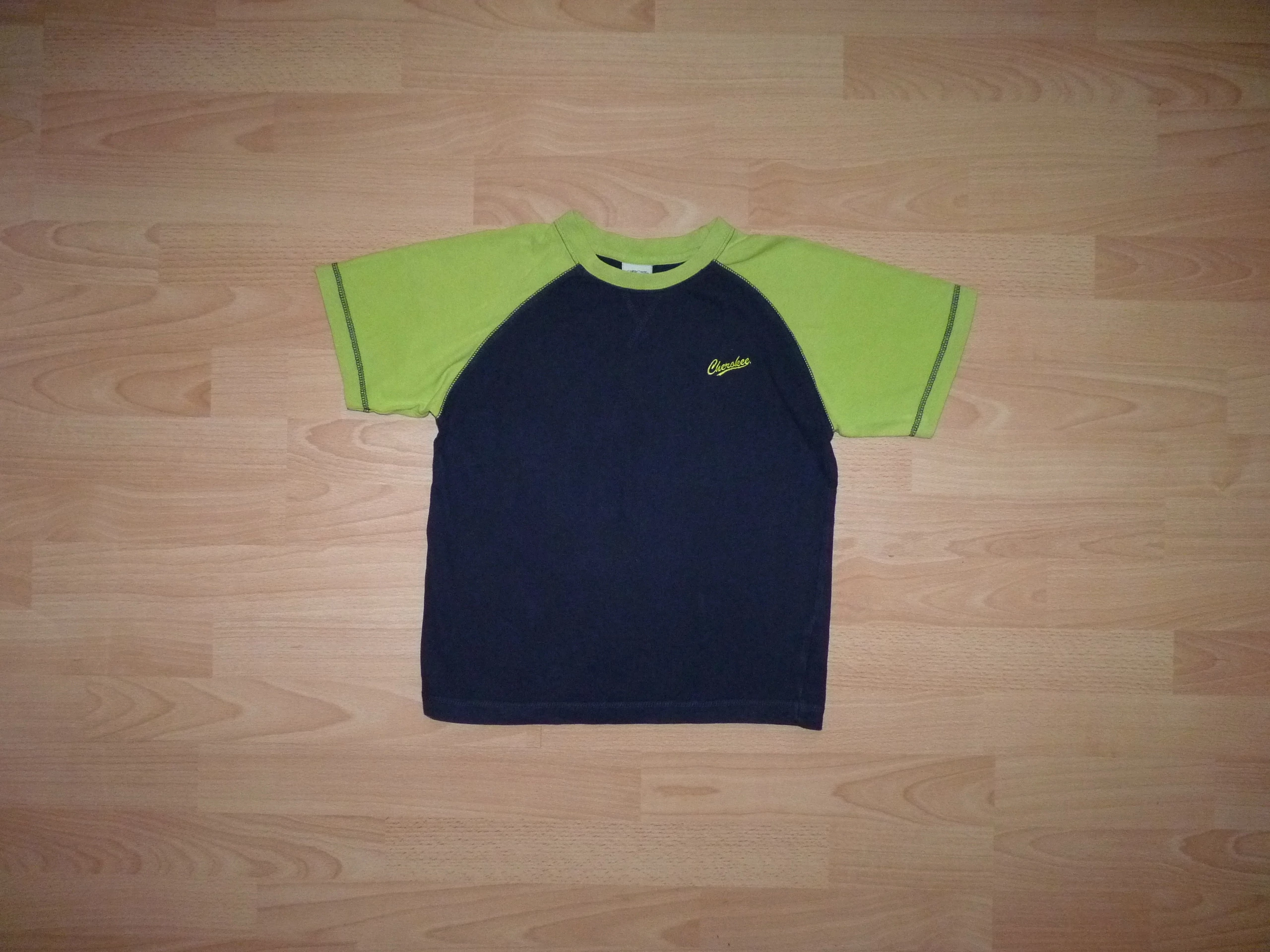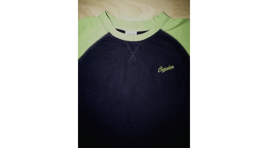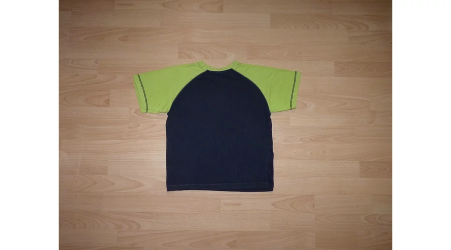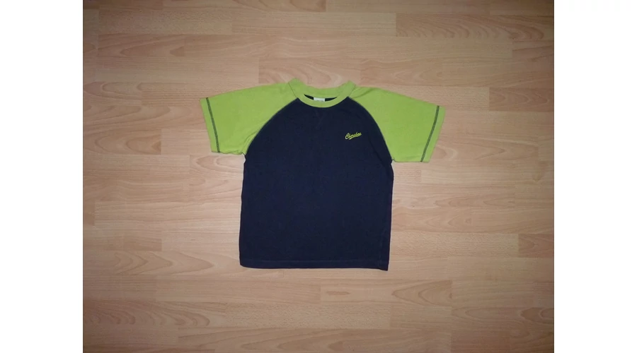 Kellemes viseletű, kék-zöld színű pamut póló. Jó állapotú, kényelmes darab, hátul a vállán egy apró lyuk, de ez a használatot nem befolyásolja. Beleírt méret 6-7 év. |