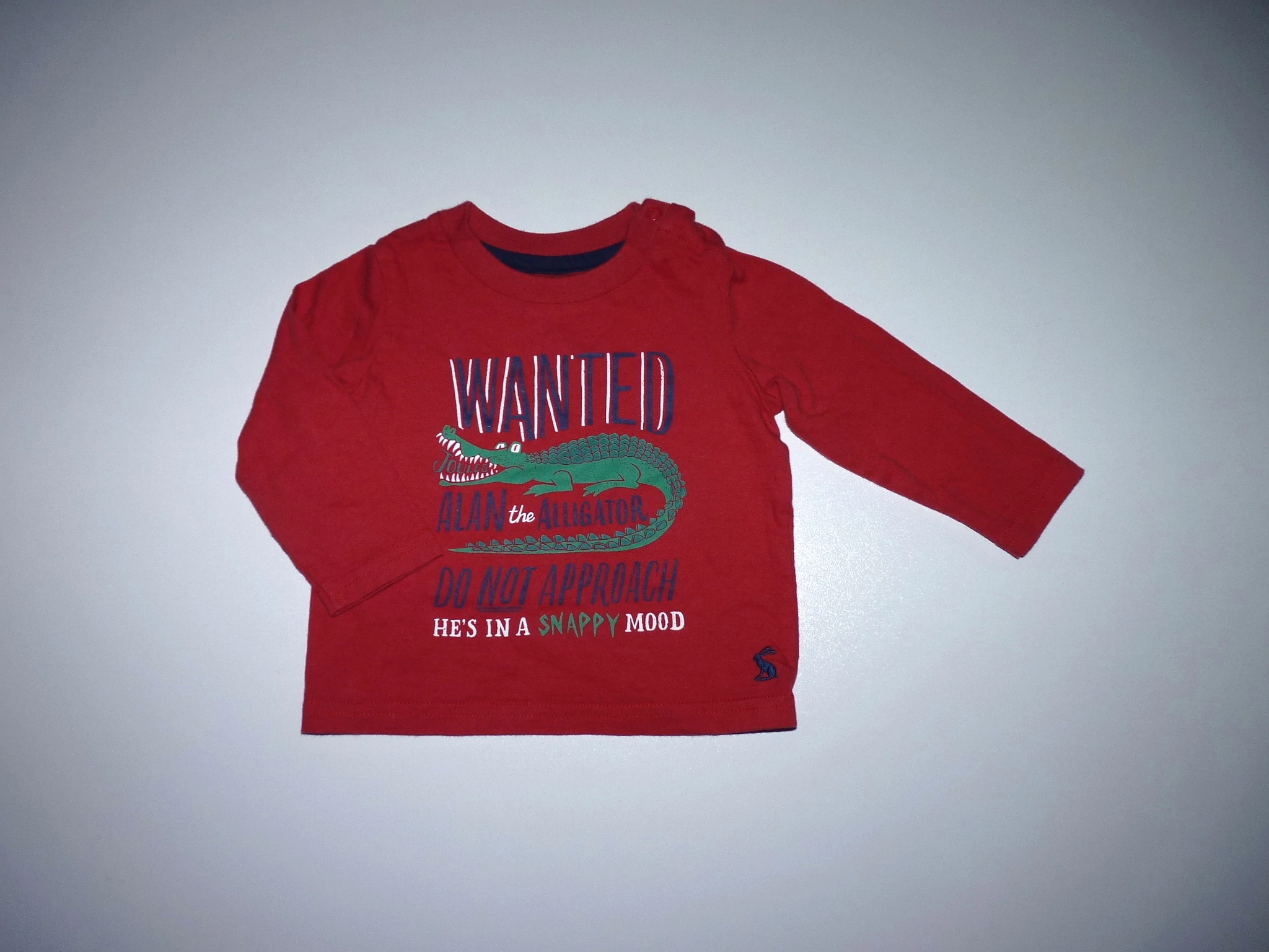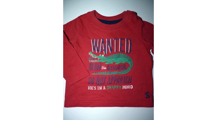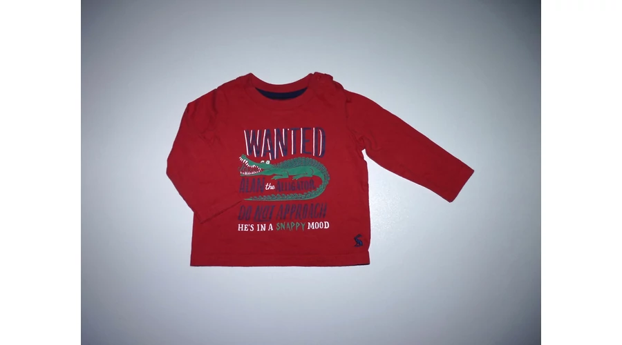 Könnyű pamut felső, bordás passzés nyakkal, hosszú ujjal, vállán gombokkal, krokodilos mintával, feliratokkal. Beleírt méret 3-6 hó. |