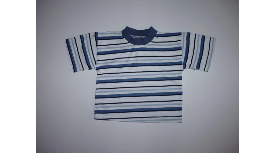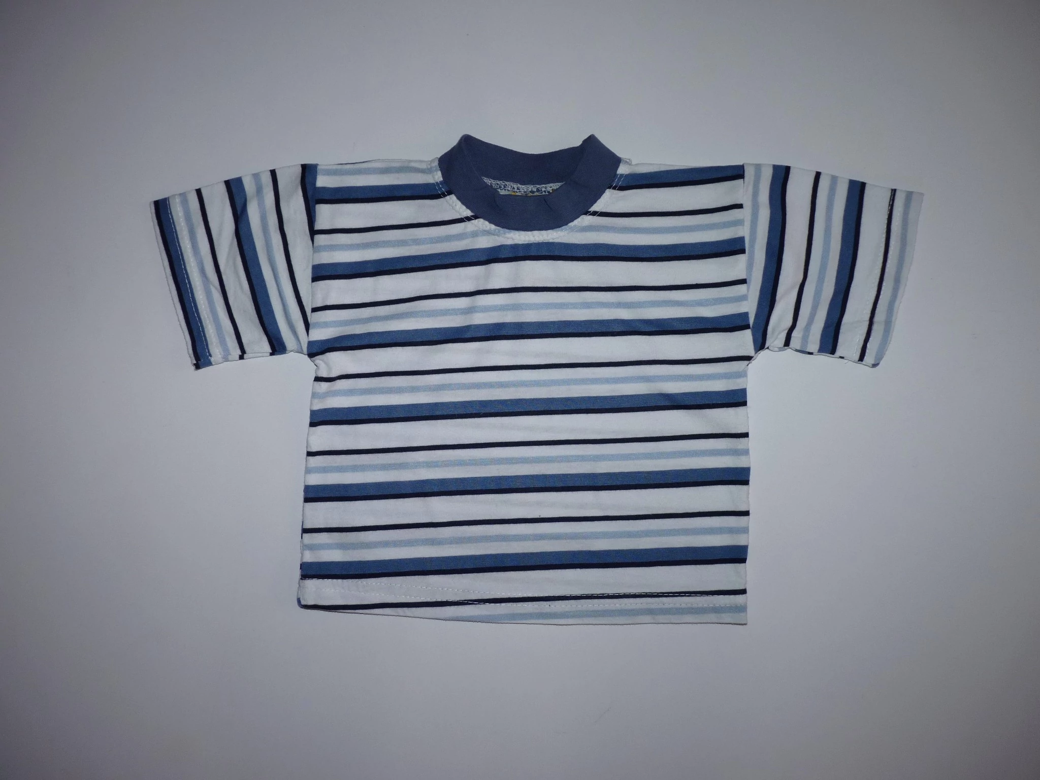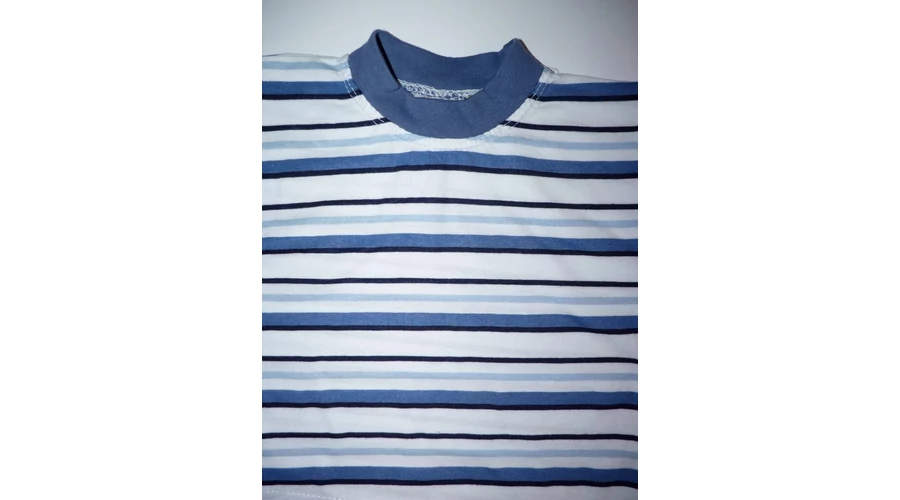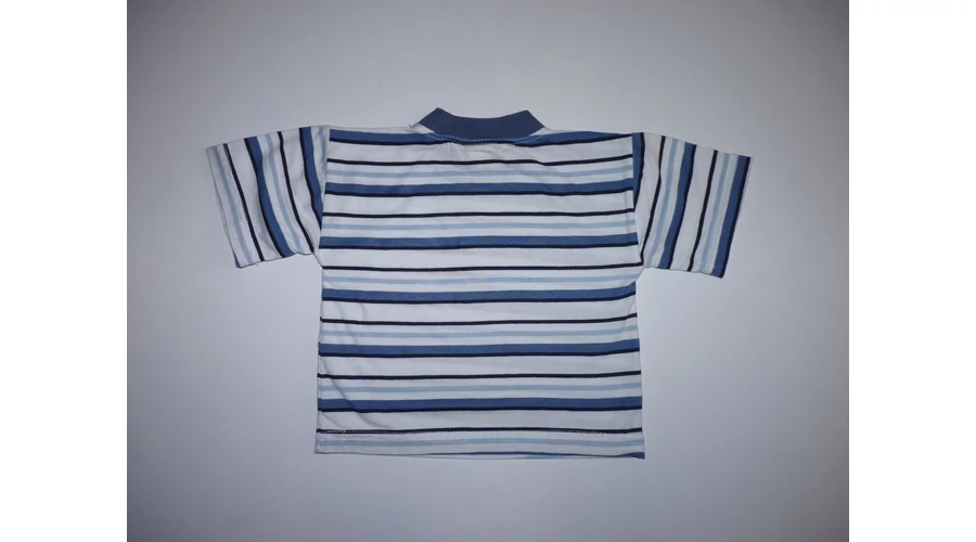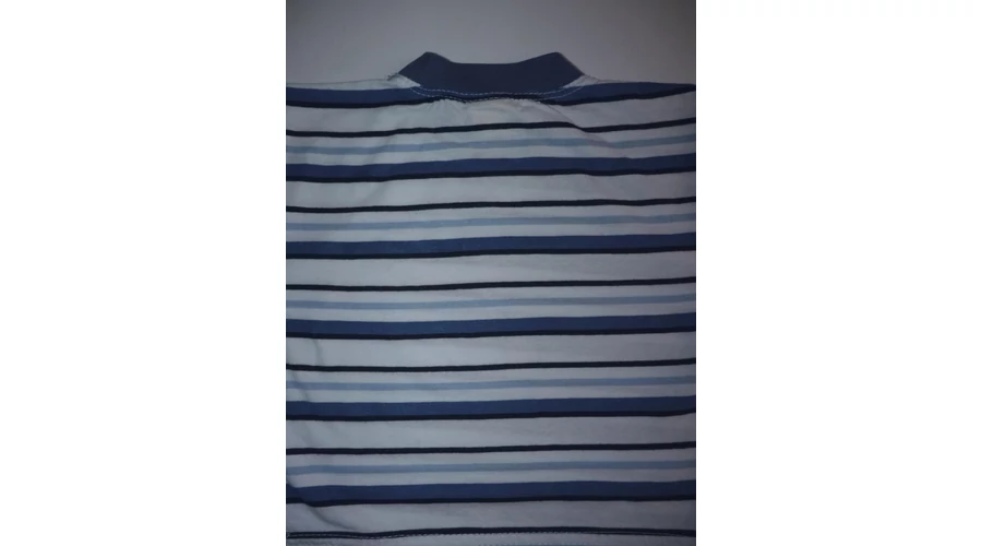 Kellemes viseletű, pasis pamut póló. Kék-fehér-fekete csíkos, nyakán kék szegéllyel. Beleírt méret nincs.