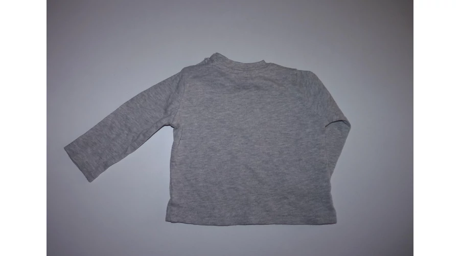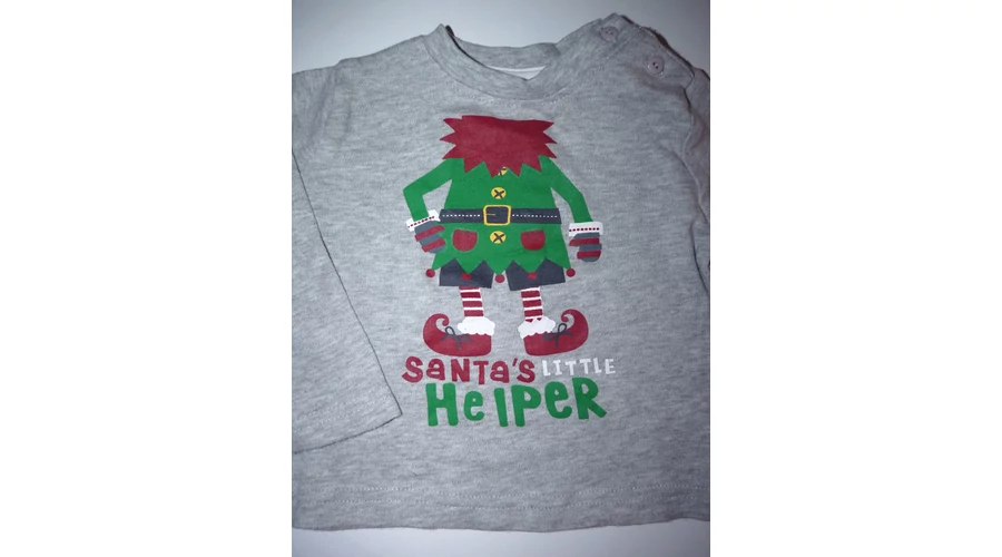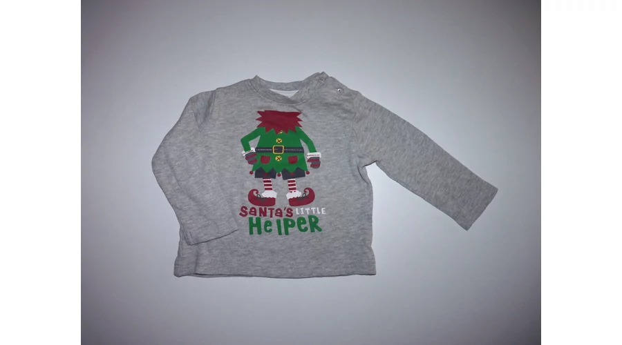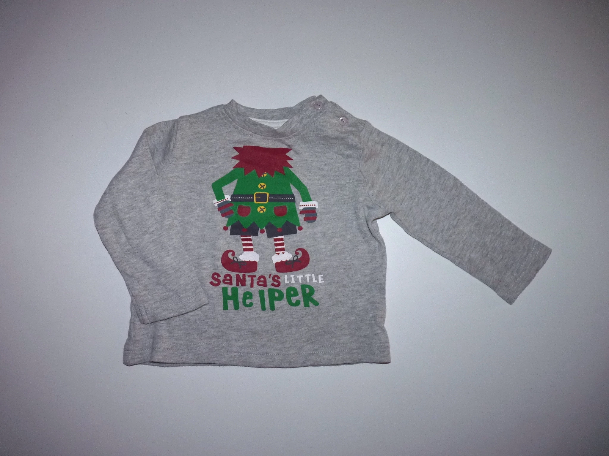 Hosszú ujjú puha felső egyik vállán gombolással, kerek nyakkal, elején Zöld Manós mintával, "Santa's little Heiper" felirattal. Beleírt méret nincs.