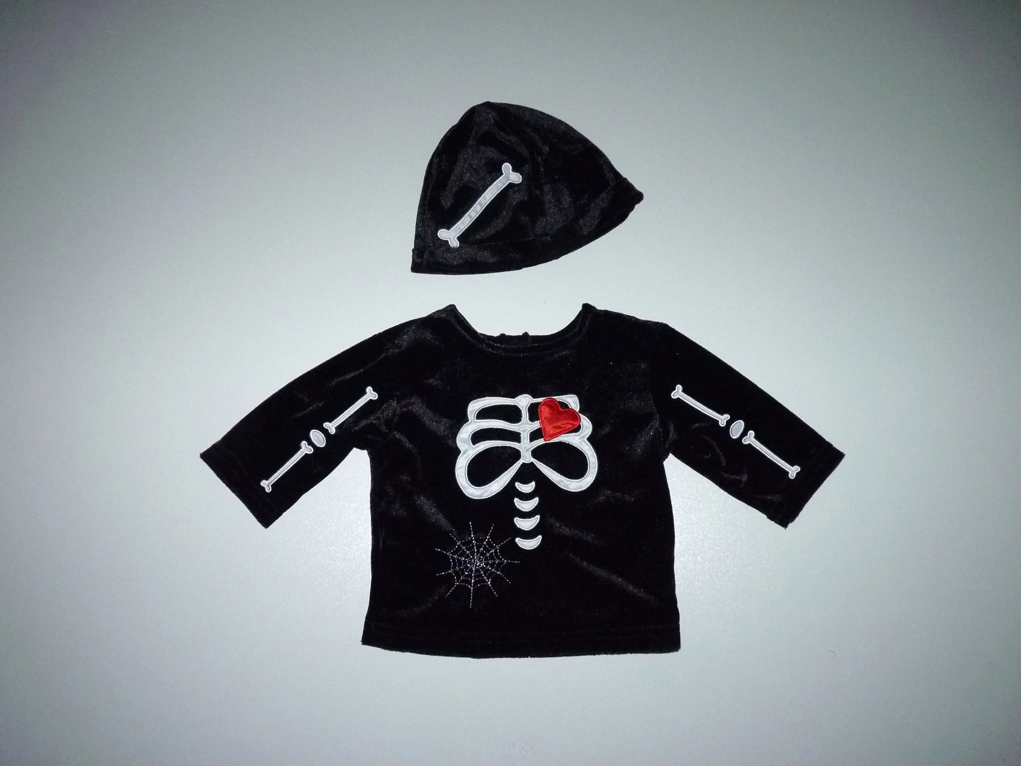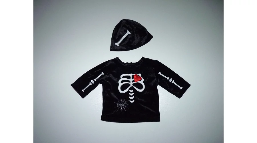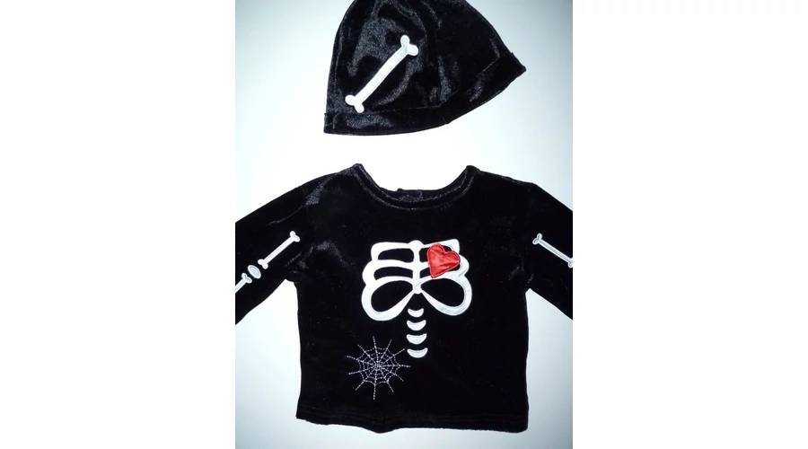Két részes puha plüss jelmez ezüst pókhálóval, csontváz mintával, elején szívecskével, hátán tépőzárral. Beleírt méret 3M (62) |