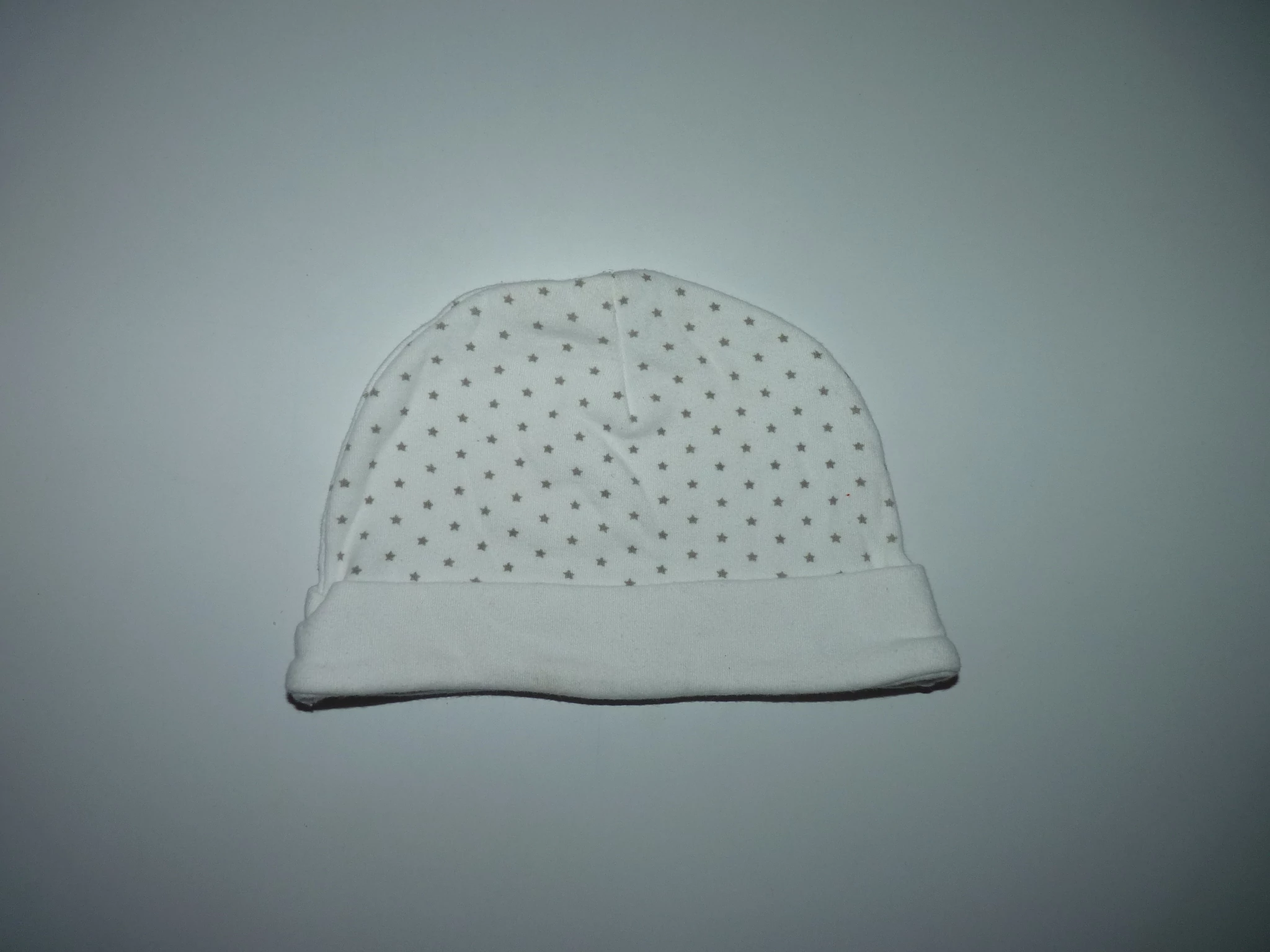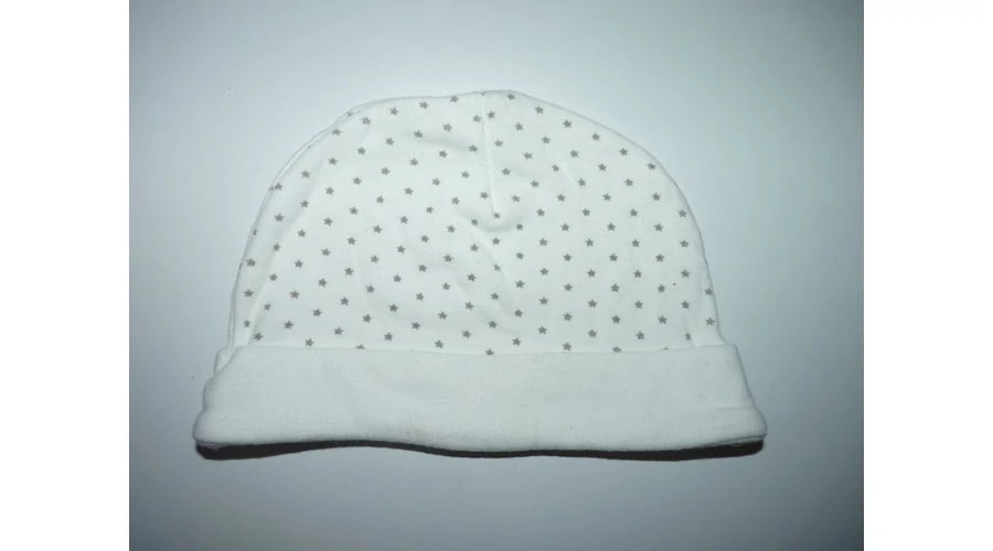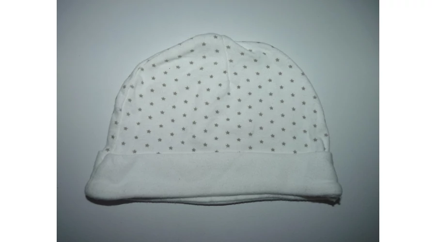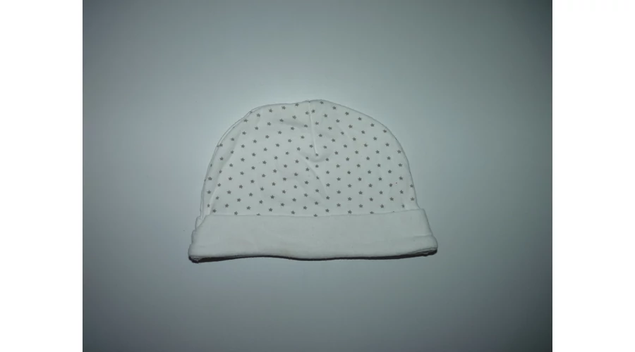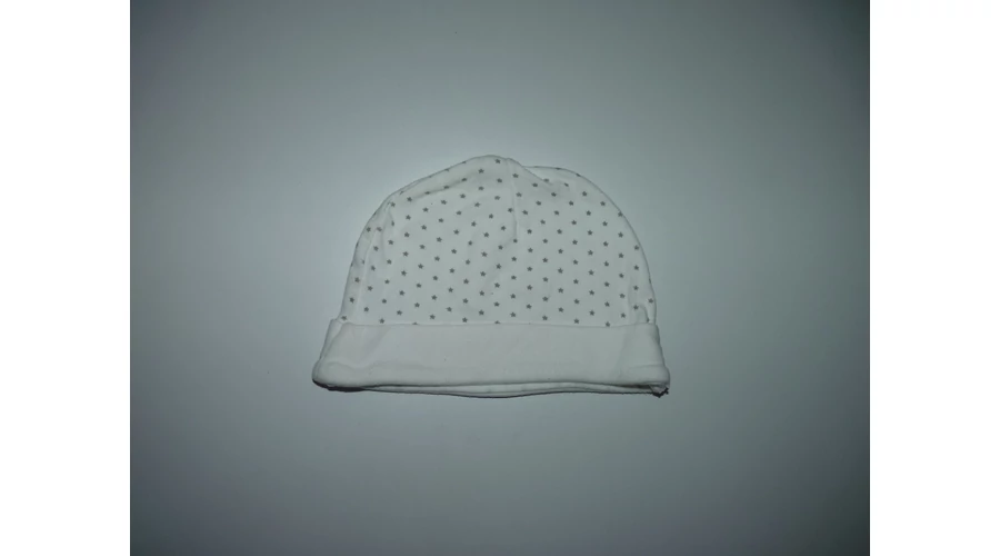 Tündéri fehér baba sapka, apró csillagokkal. Puha, kellemes viseletű, pamut anyagú. Beleírt méret 3-6 hó.Alsó átmérője (az alsó karimánál mérve): 17-23 cmx2Tetejétől az aljáig a hossza elől: 12 cm |