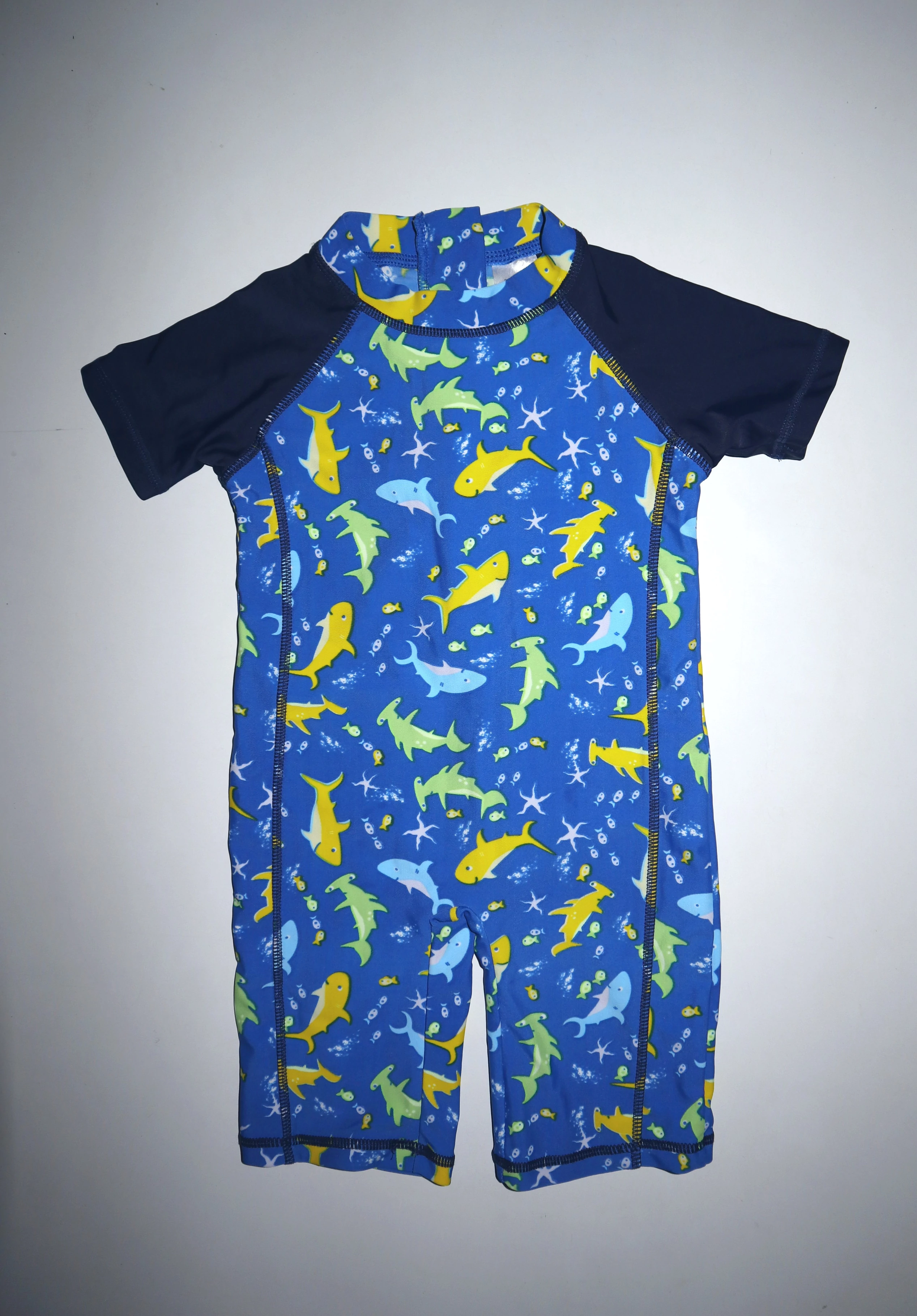 Kék fürdőoverál kis állónyakkal, nyaki hátsó részén cipzárral, cipzár alatt betétcsíkkal, raglánujjal, vagány cápás mintával. Rugalmas anyagú, a mért hossz a kihúzás nélkül mért hossz. Nagyon jó állapotú, elől két pici halvány folt, mintha vizes lenne. Beleírt méret nincs. |