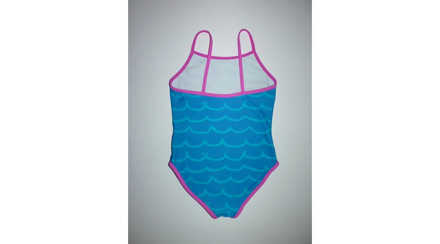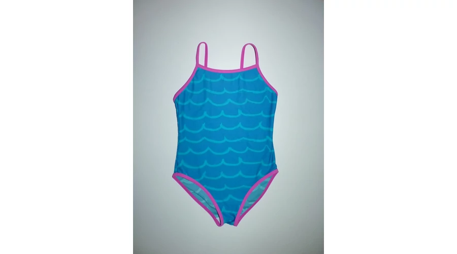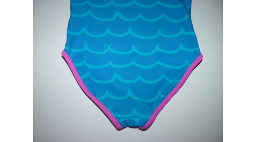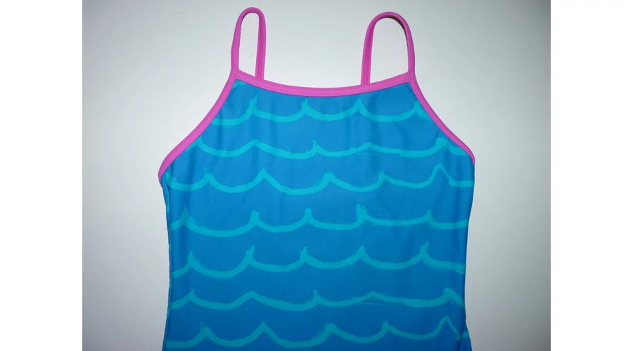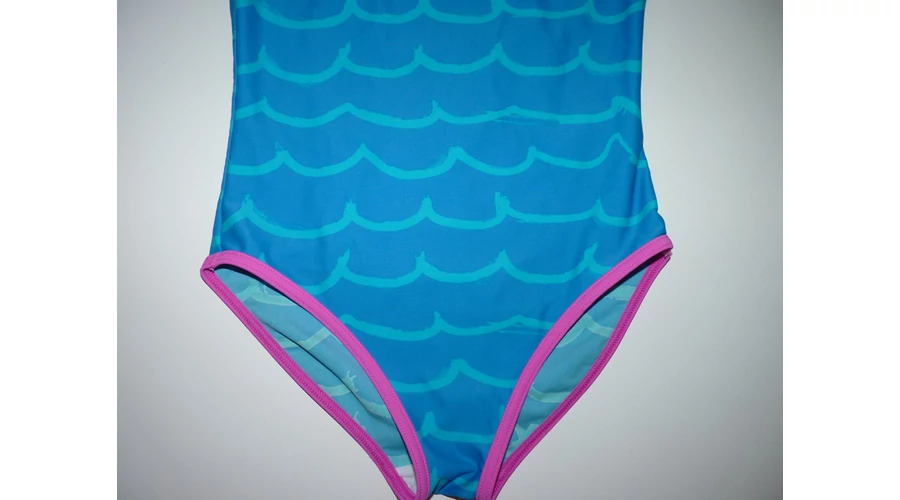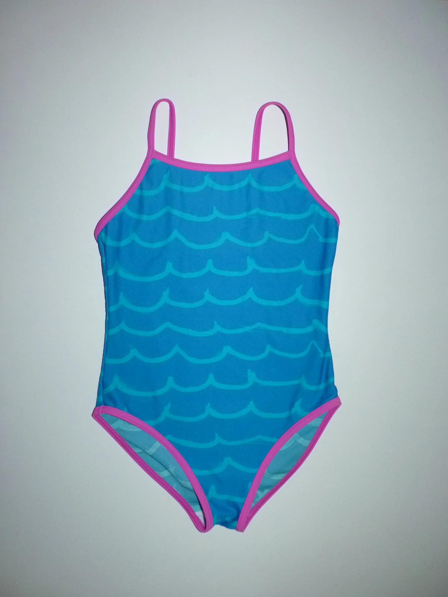 Kényelmes, elől bélelt fürdőruha ciklámen szegéllyel, keskeny vállpánttal, szuper hullám mintával. Rugalmas fürdőruhaanyagú, a mért hossz a kihúzás nélkül mért hossz. Nagyon jó állapotú. Beleírt méret 6-7 év (122) |
