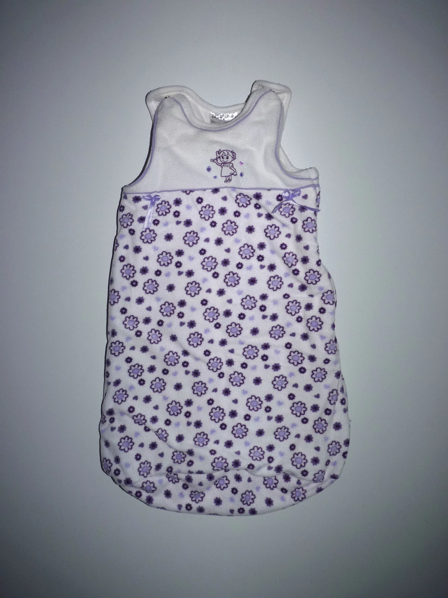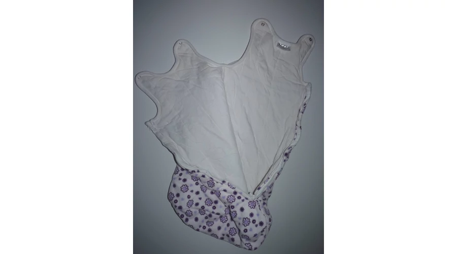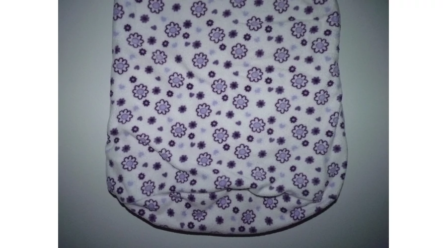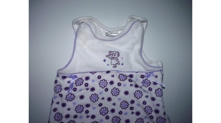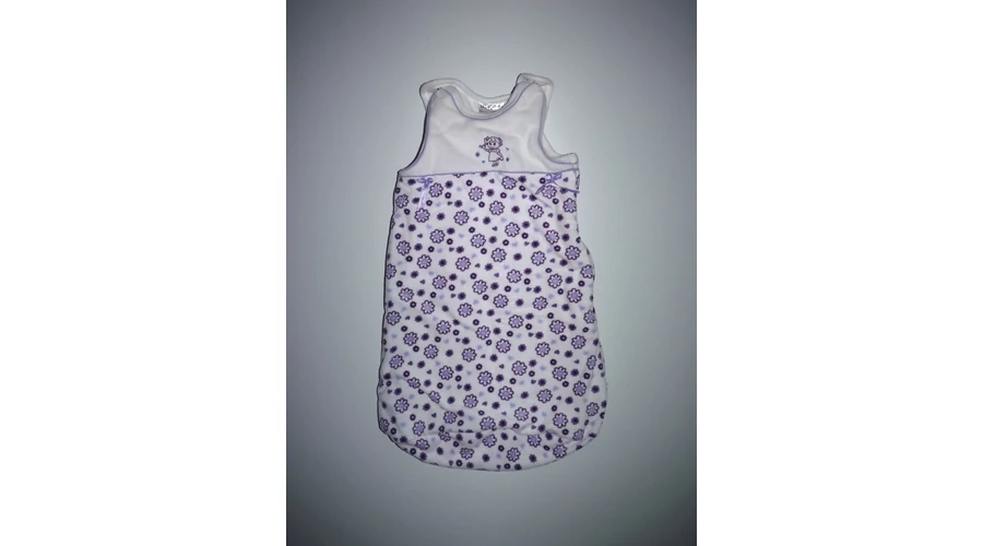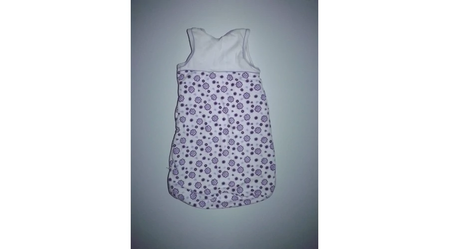 Párnázott, puha, meleg hálózsák két vállán patenttal, egyik oldalán alulról húzható cipzárral, végén védőrésszel, pamut béléssel, lila virágmintával, kis szatén masnival. Használt, a pamut bélésen nyakánál/vállánál belül kis elszíneződés. Beleírt méret 70 cm. |