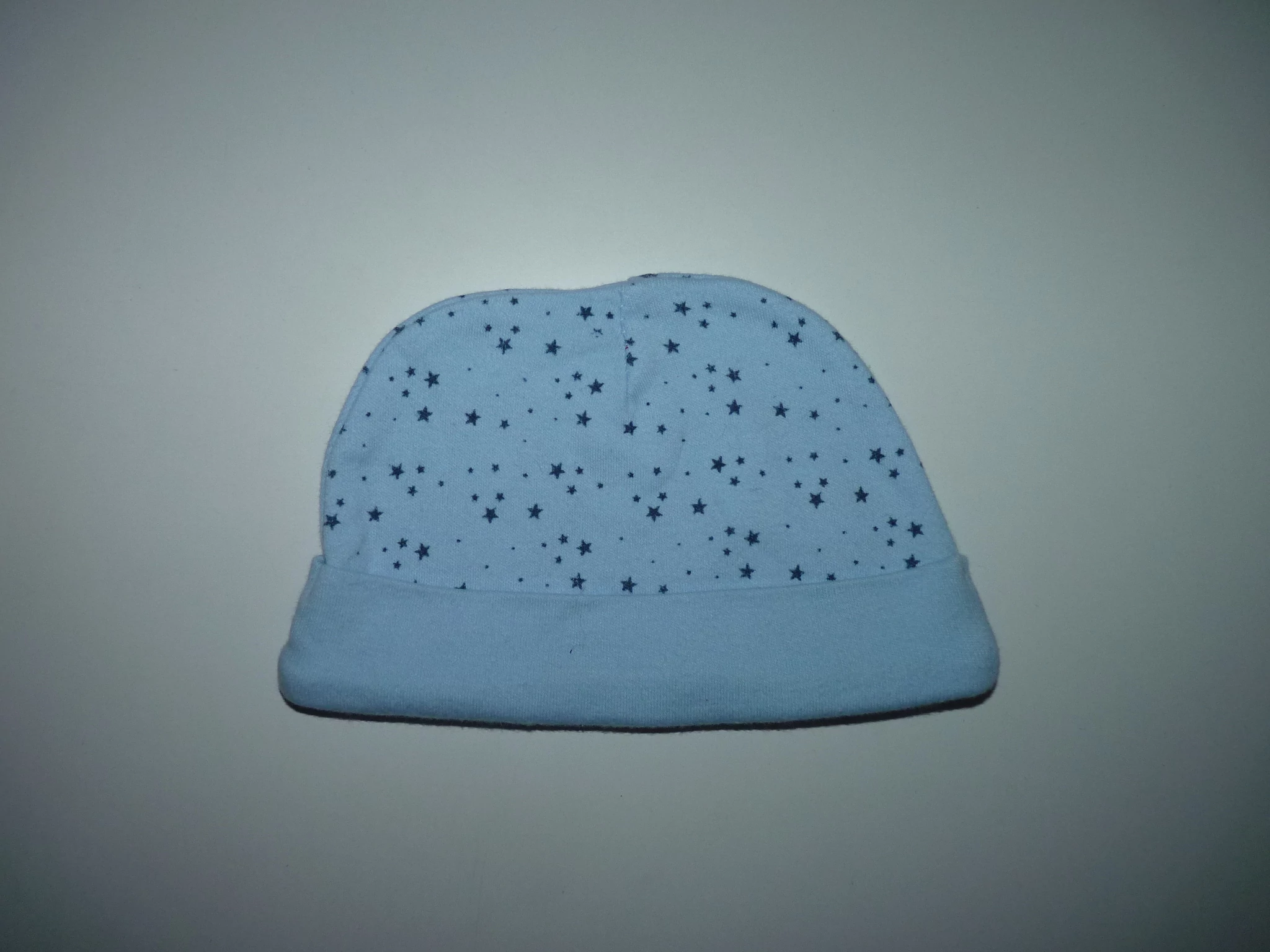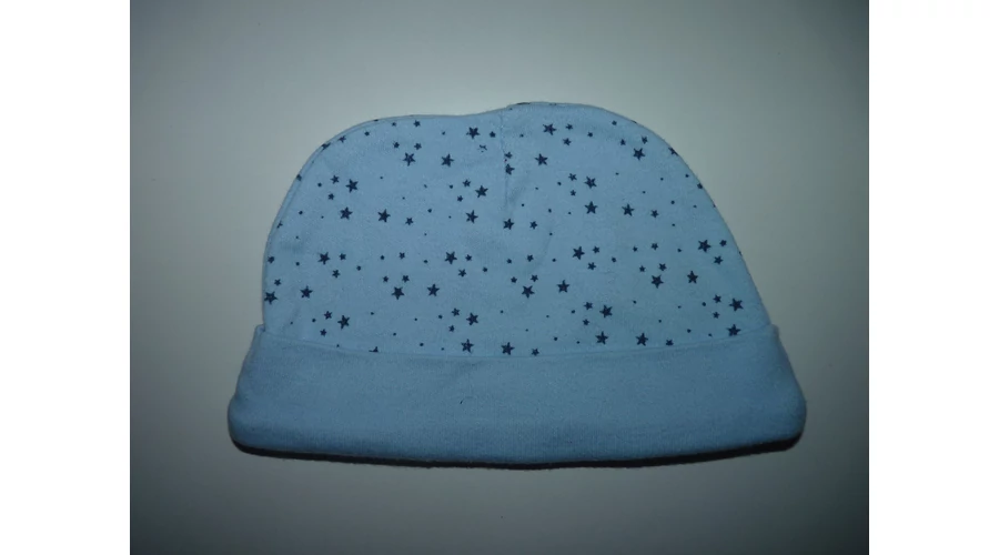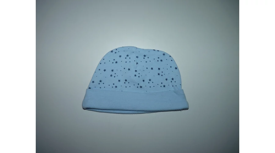 Világoskék színű, apró csillagos baba sapka. Puha, kellemes viseletű, pamut anyagú. Beleírt méret 56.Alsó átmérője (az alsó karimánál mérve): 15-19 cmx2Tetejétől az aljáig a hossza elől: 10,5 cm |